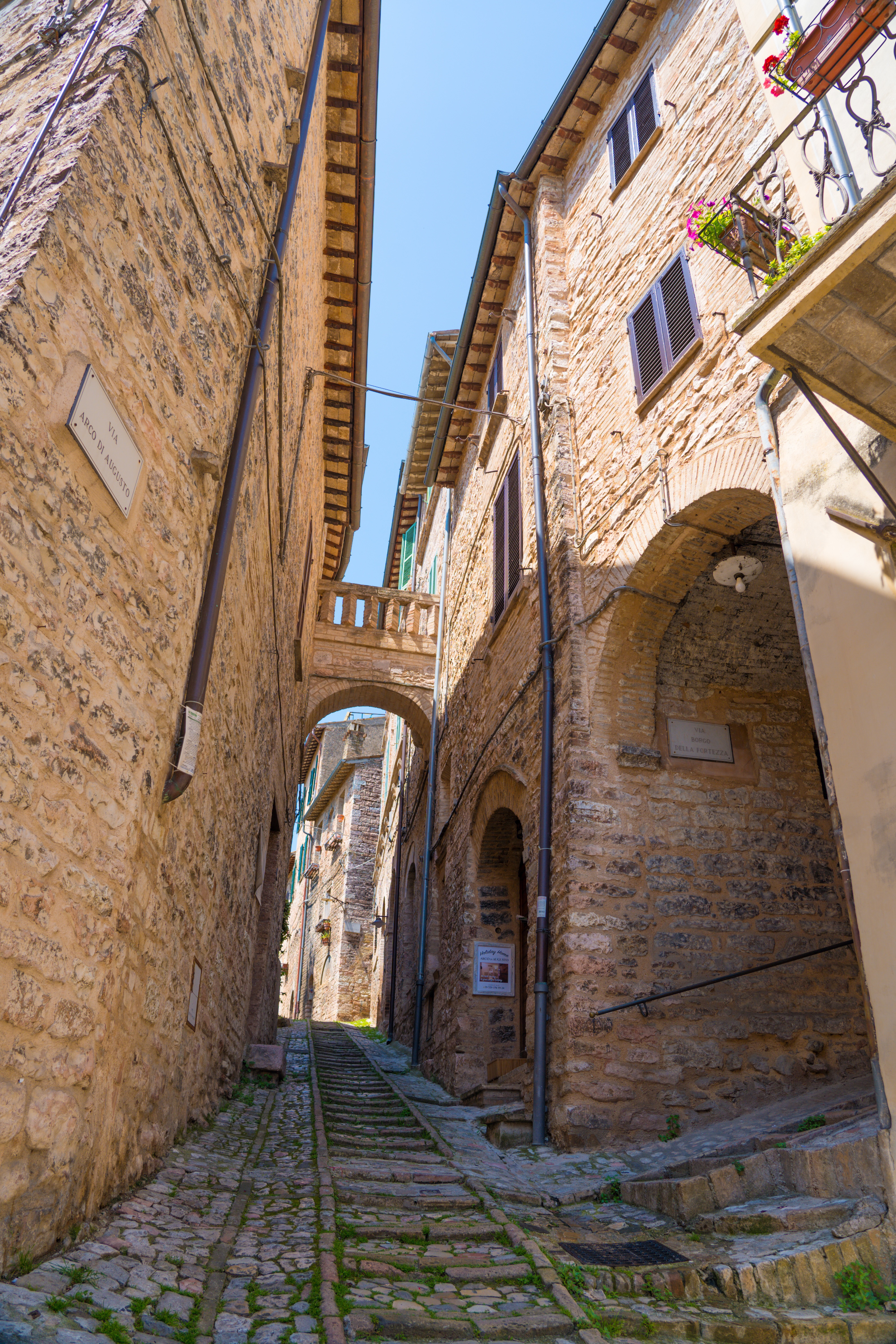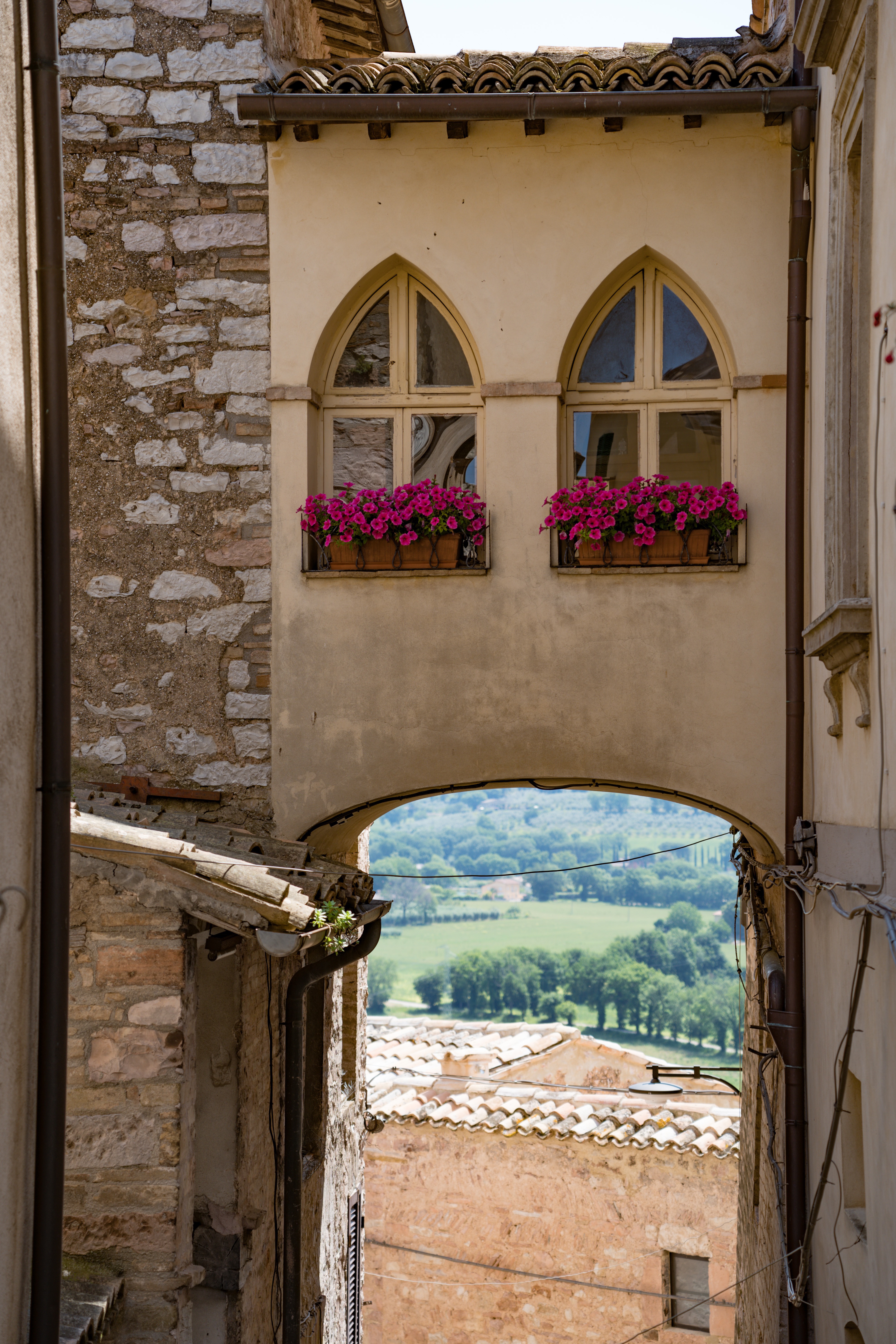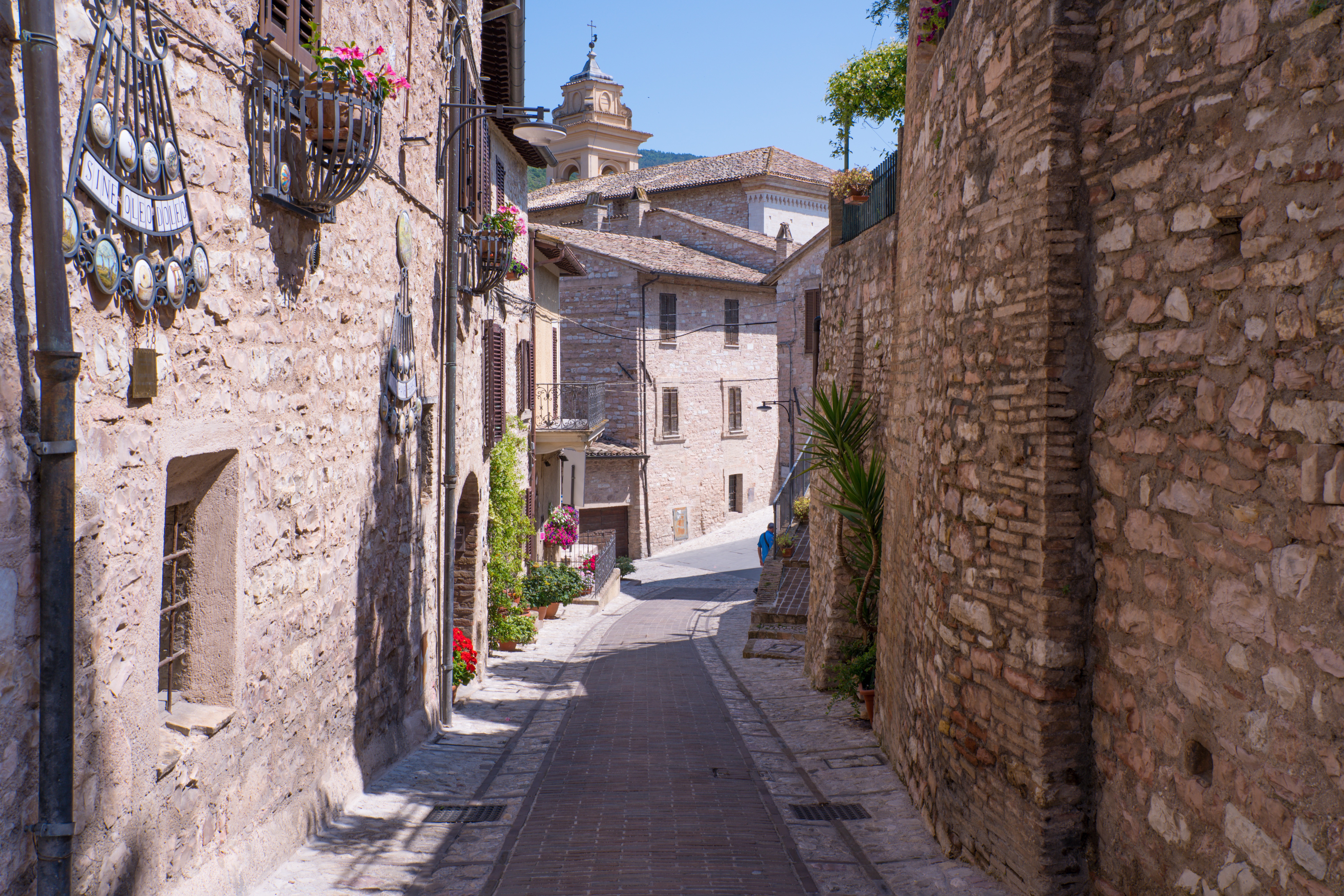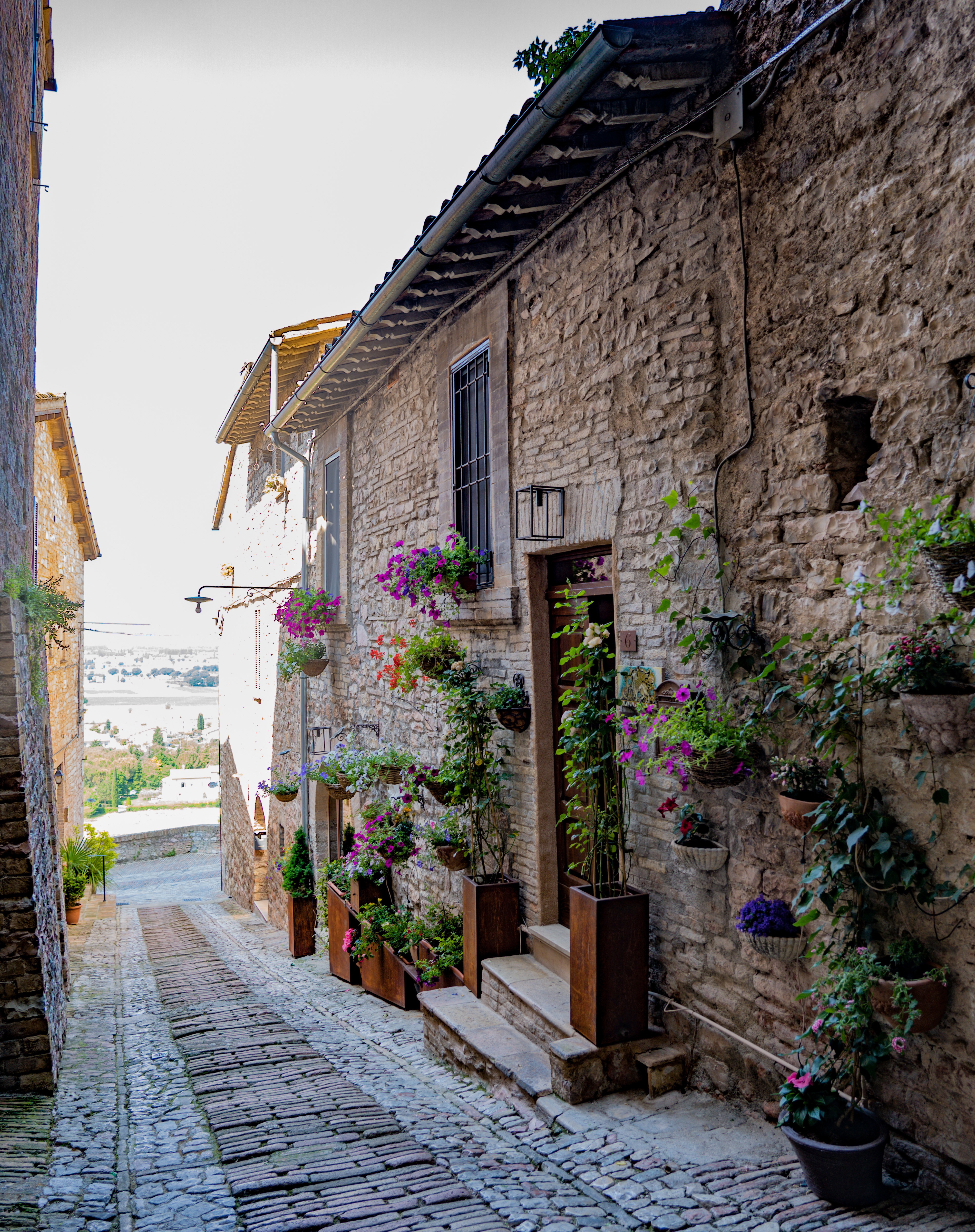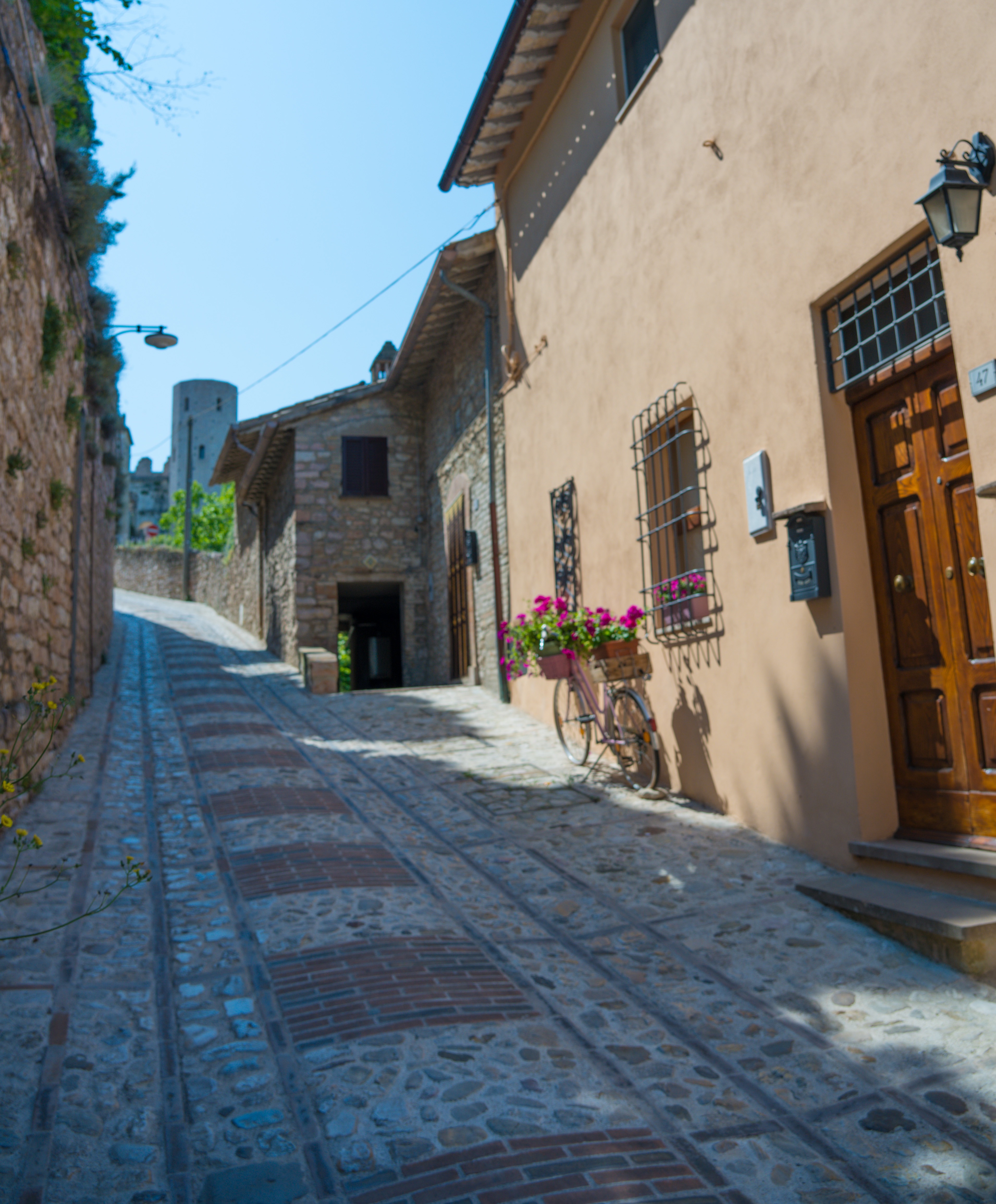 We entered through a grand gateway flanked by towers, amazed that there was not a soul around. In fact that is one of the main appeals of this town – it is so close to Assisi but there are so few tourists here. The streets and buildings are quiet, taking on a pink hue from the Mount Subasio limestone used in their construction. The constant call of swallows can be heard as they swoop catching flies around the rooftops, and the hum of insects on the ever present flowers.
