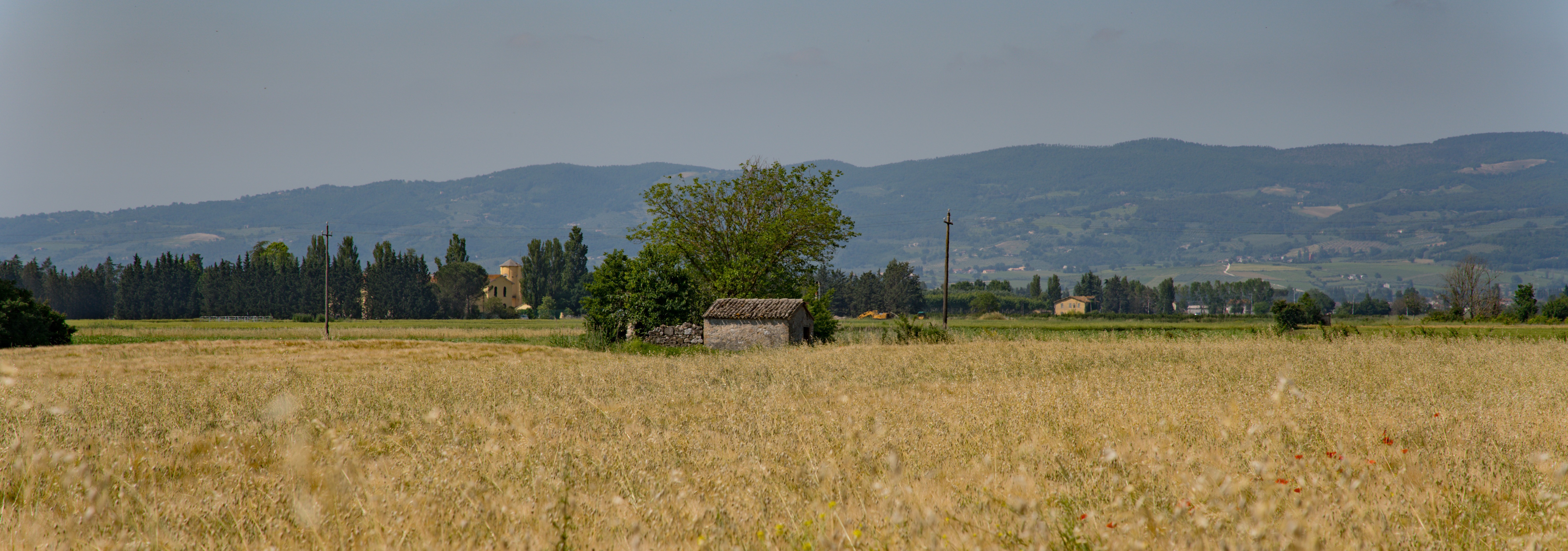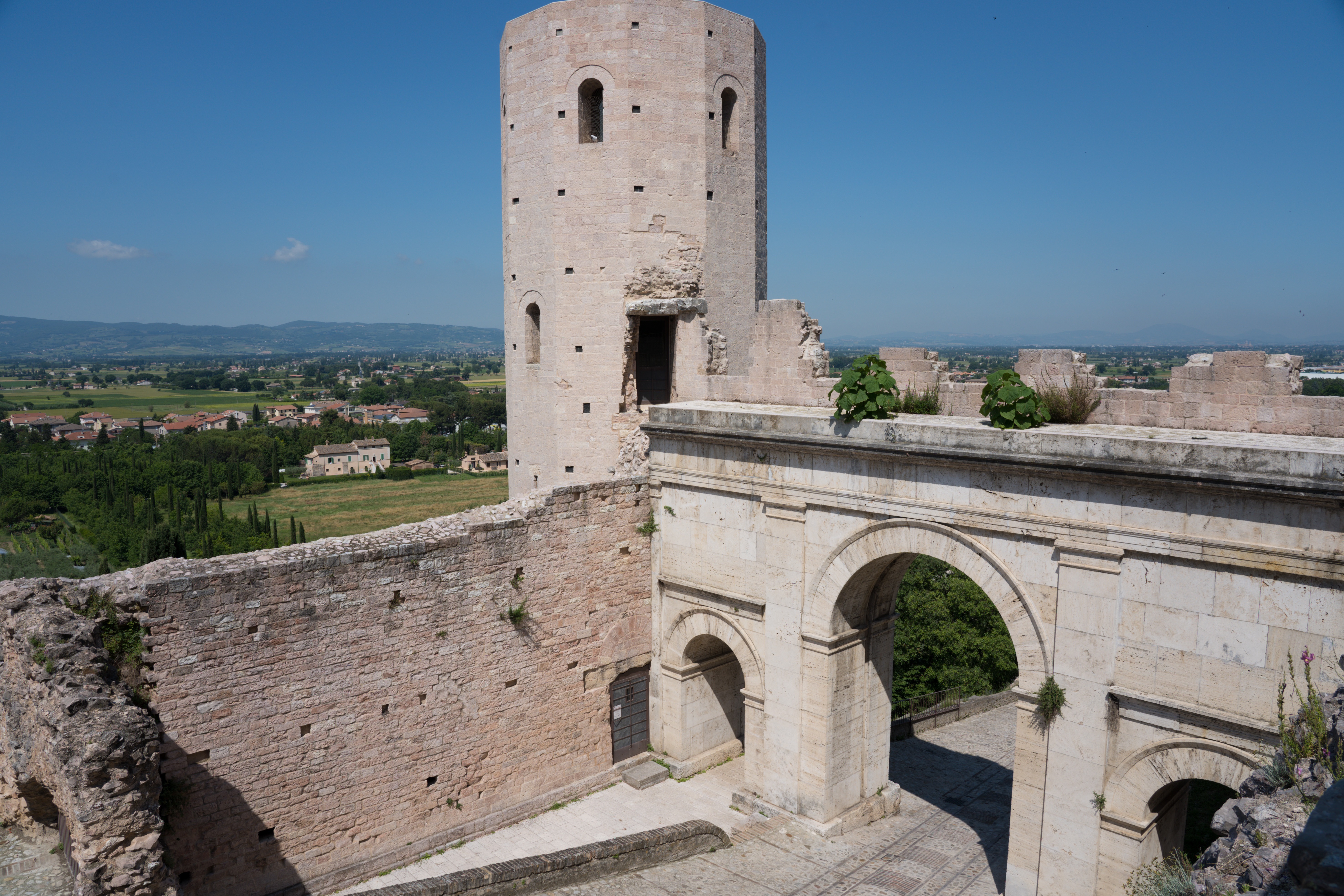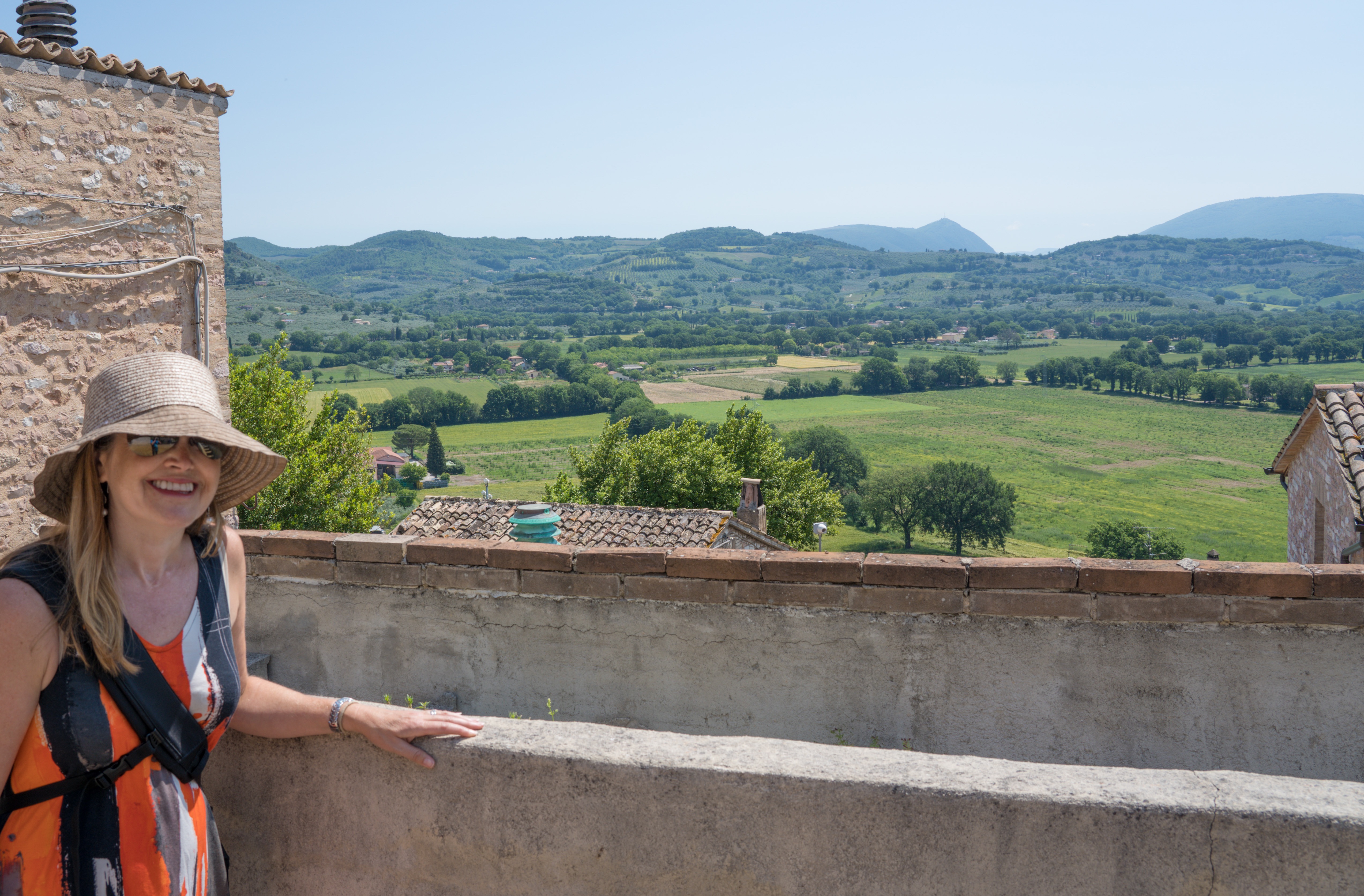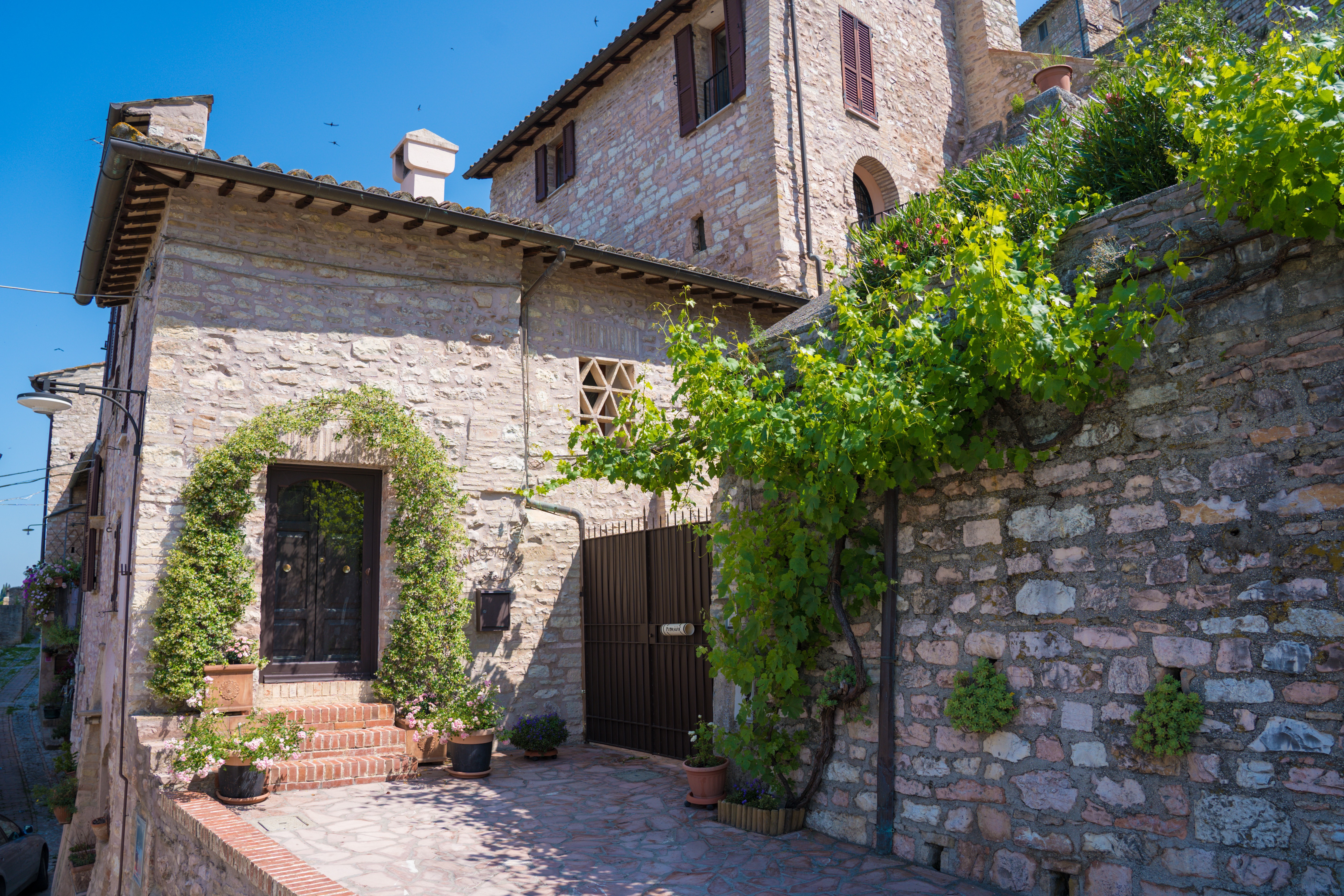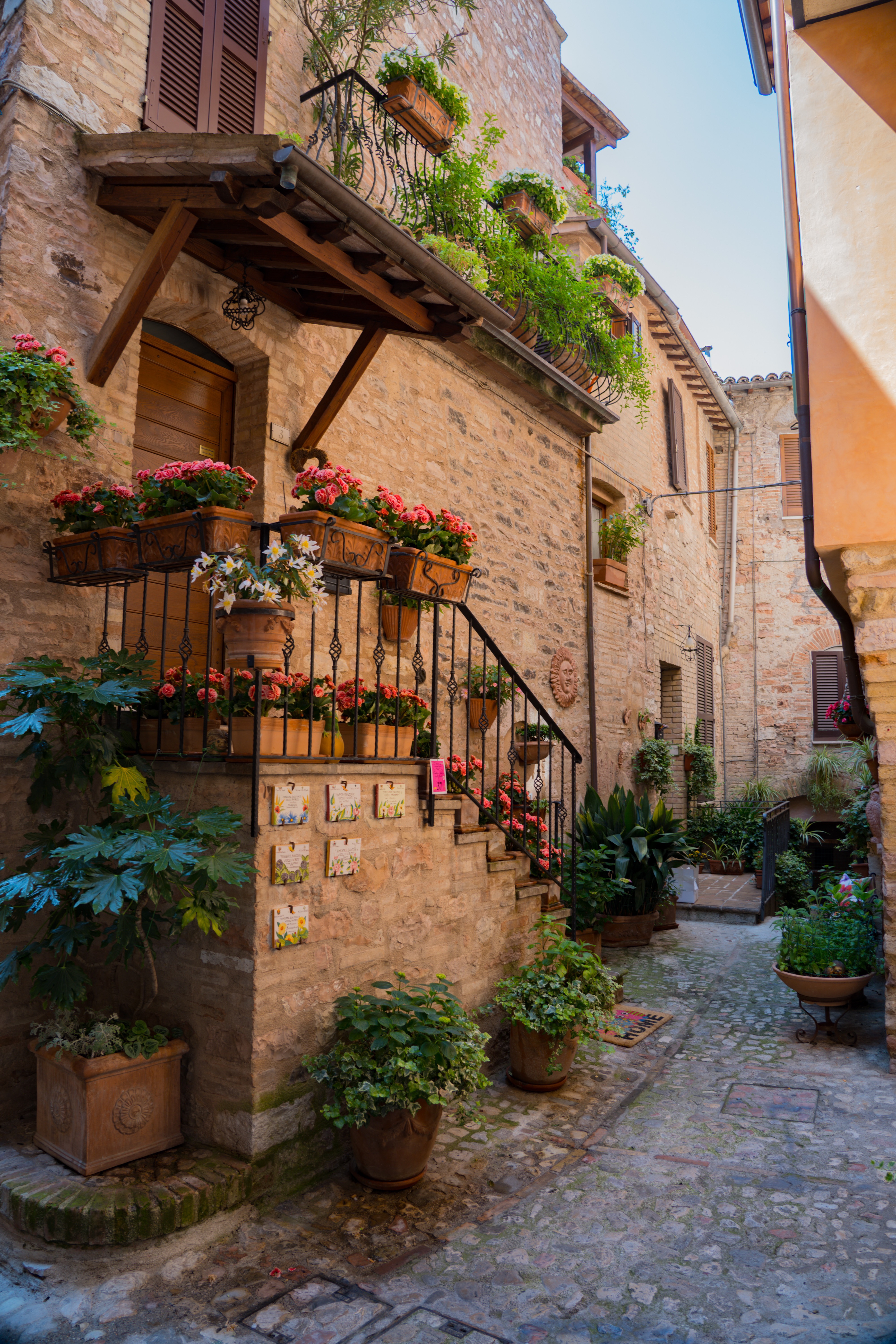 We entered through a grand gateway flanked by towers, amazed that there was not a soul around. In fact that is one of the main appeals of this town – it is so close to Assisi but there are so few tourists here. The streets and buildings are quiet, taking on a pink hue from the Mount Subasio limestone used in their construction. The constant call of swallows can be heard as they swoop catching flies around the rooftops, and the hum of insects on the ever present flowers.