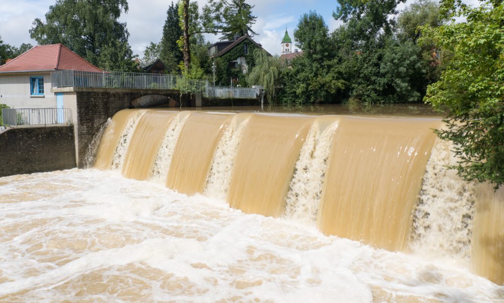 The River Argen is very full after the heavy rain, In the background, St Martin’s church which rings out the hour…