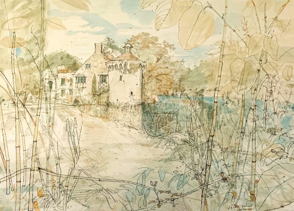 A pen and watercolour artwork in the house, looking across at the old castle