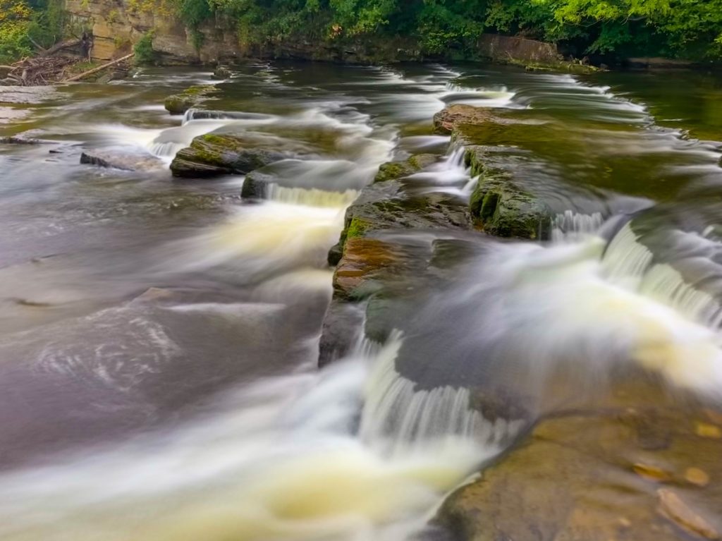The waterfalls tinted with the tannins of autumn leaves