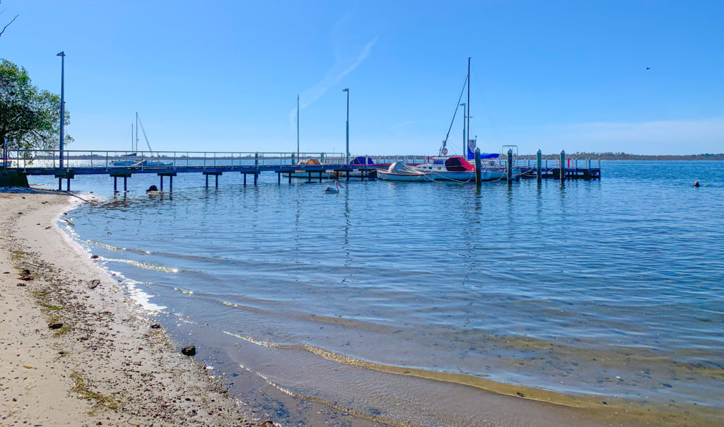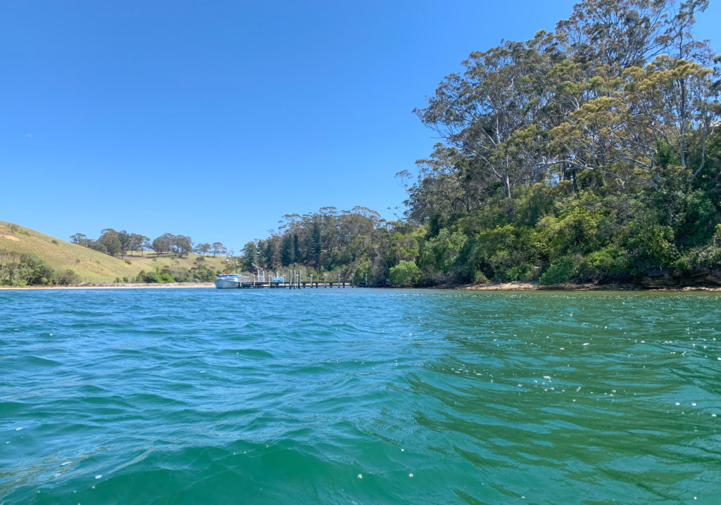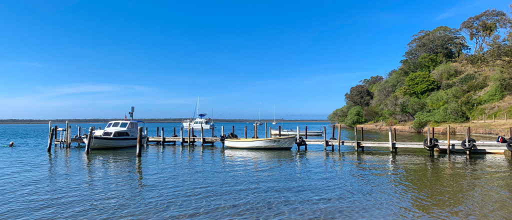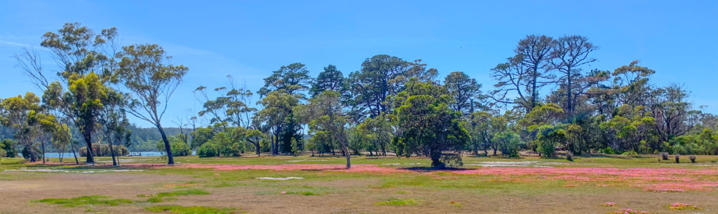 McAuliff’s Island, home to a private holiday retreat and covered in Glaucous Pigface (the pink flowers!)