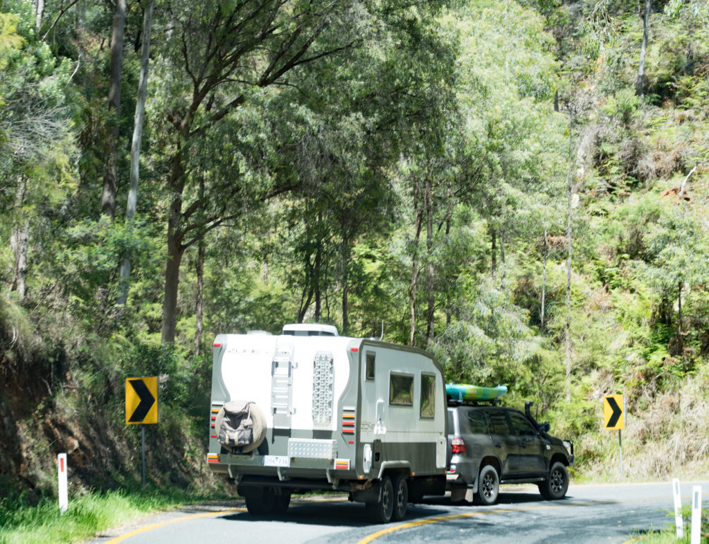 Our very well matched, colour co-ordinated mini convoy set off, with me a little nervous about dragging over 3 tons of van over the highest bitumen road in Australia. Our friends who had grown up in the area, were faintly amused at me, and the “nervous Nellie” phrase was bandied around at one stage over the radio link we were were using. Australian humour at its best, it‘s almost British, and our friends Mark and Diane were super helpful with advice on how to drive to get safely over the mountain.