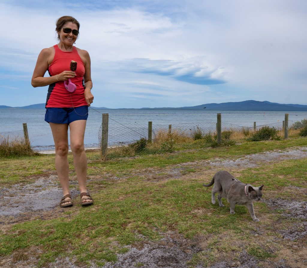 We have stayed at this campsite at Yanakie Bay before. It’s just outside the National Park which comprises most of the surrounding coastline, so we can take Tassie, our adventure cat. It has some “premium” sites metres from the beach. Best of all, at this time of year there has only been a couple of vans here in the two days we have soaked up the serenity.