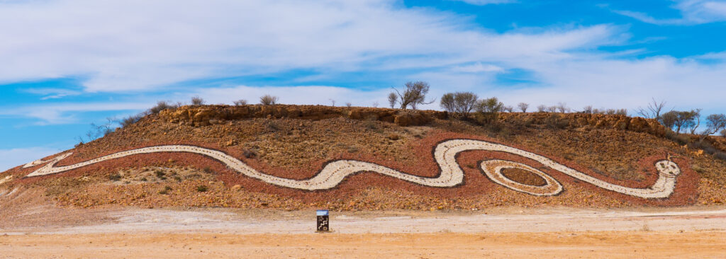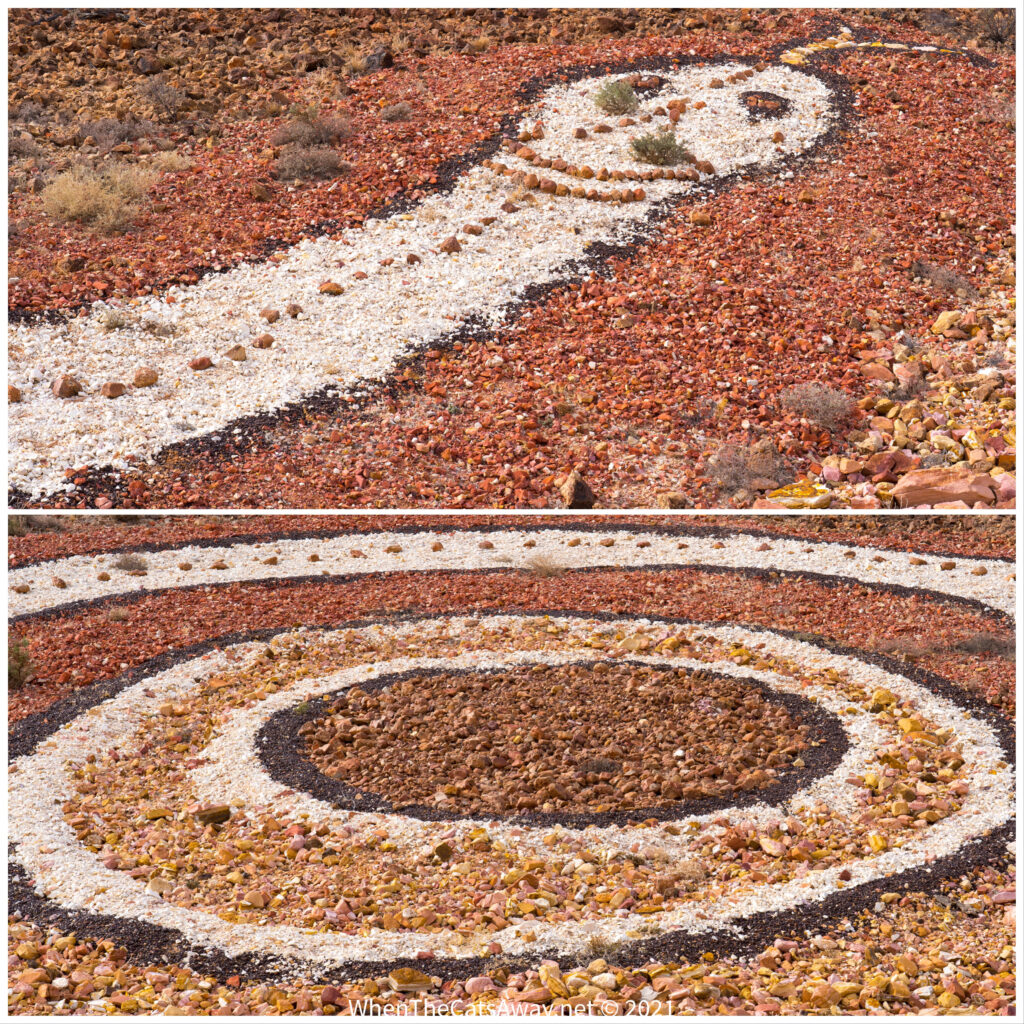 There are occasional rest areas, sometimes with picnic tables and toilets, a chance to break up the monotony of the journey. Mid afternoon we saw a slight uplift on the side of the road, decorated with a giant serpent. The Dreamtime Serpent is an important figure in the Aboriginal creation story, representing the mythological serpent which joined all the waterways throughout Mithaka Country. This artwork had been created with different coloured gravel and gibbers from across the region.