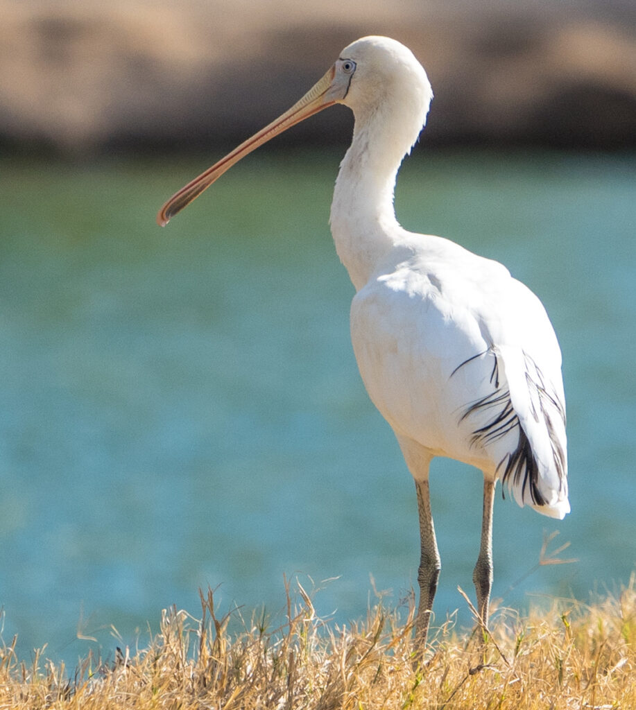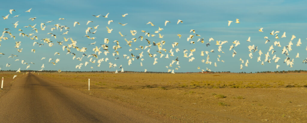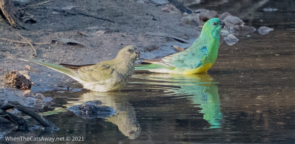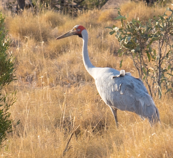 The landscape started to change as we progressed, the small drought tolerant shrubs changing to small trees, then larger trees, paddocks full of dry grasses and more undulating hills on the horizon. We called in for a lunchtime break at a rest area beside a creek (with actual water in it!) I had read was good for spotting birds. It gave us a chance to stretch our legs and think about something other than driving. We saw quite a number of birds, including flocks of budgerigars flying past, Mallee Ringneck Parrots, a White-necked Heron and more.