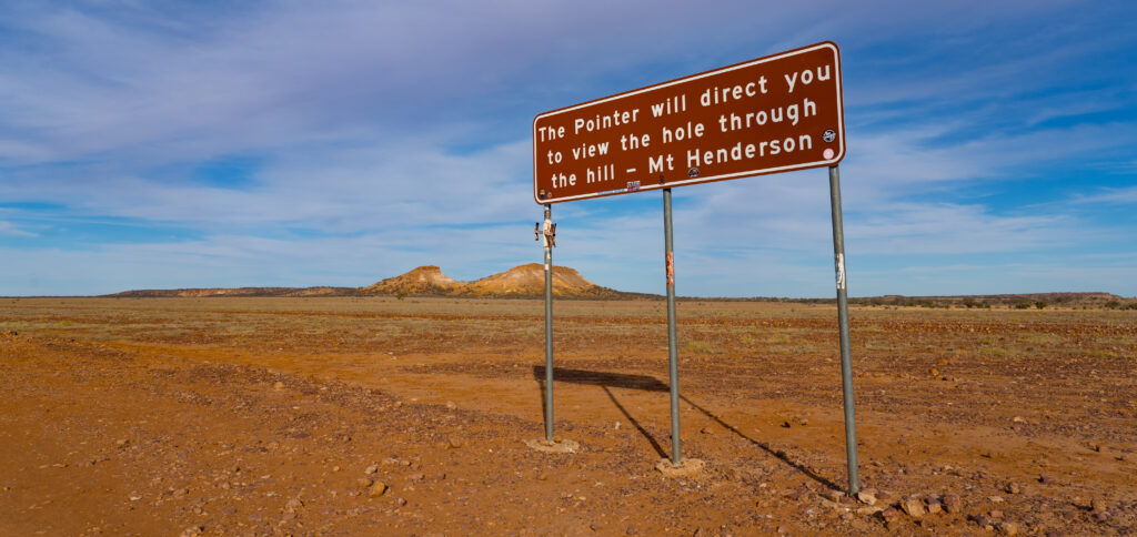 As we continued on through the afternoon, hills became more frequent, and we pulled over at this bizarre sign directing us to the ‘Hole through Mount Henderson’. There is a walk up to a lookout up on top of this, but the sun was getting low in the sky and we still had to reach Windorah for the night.