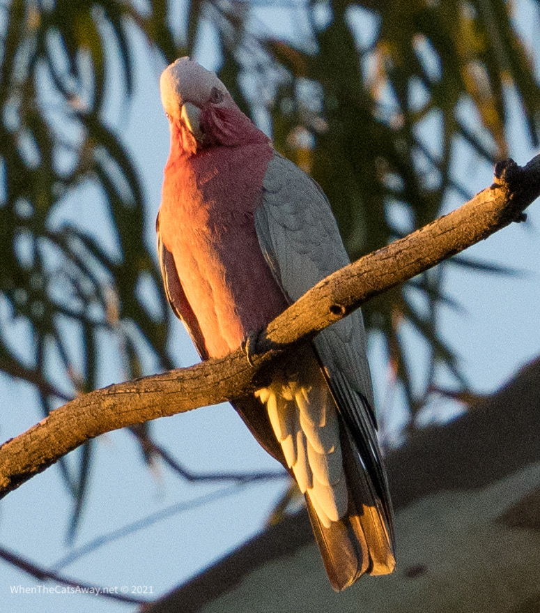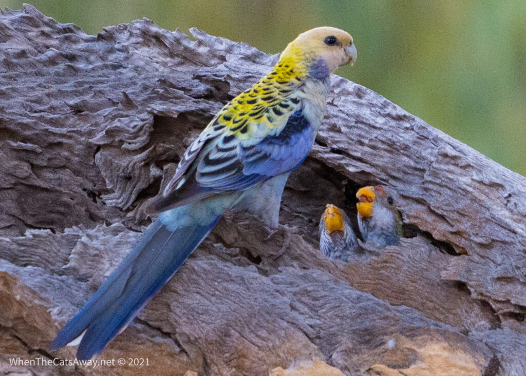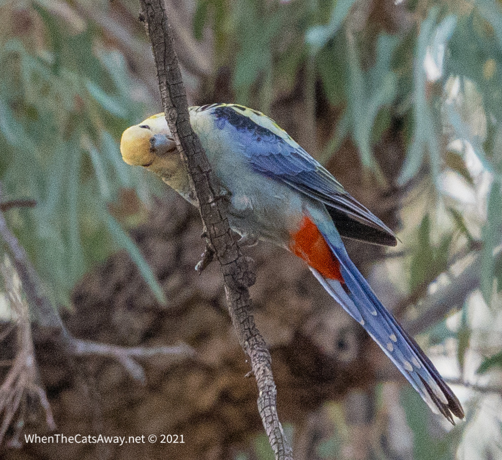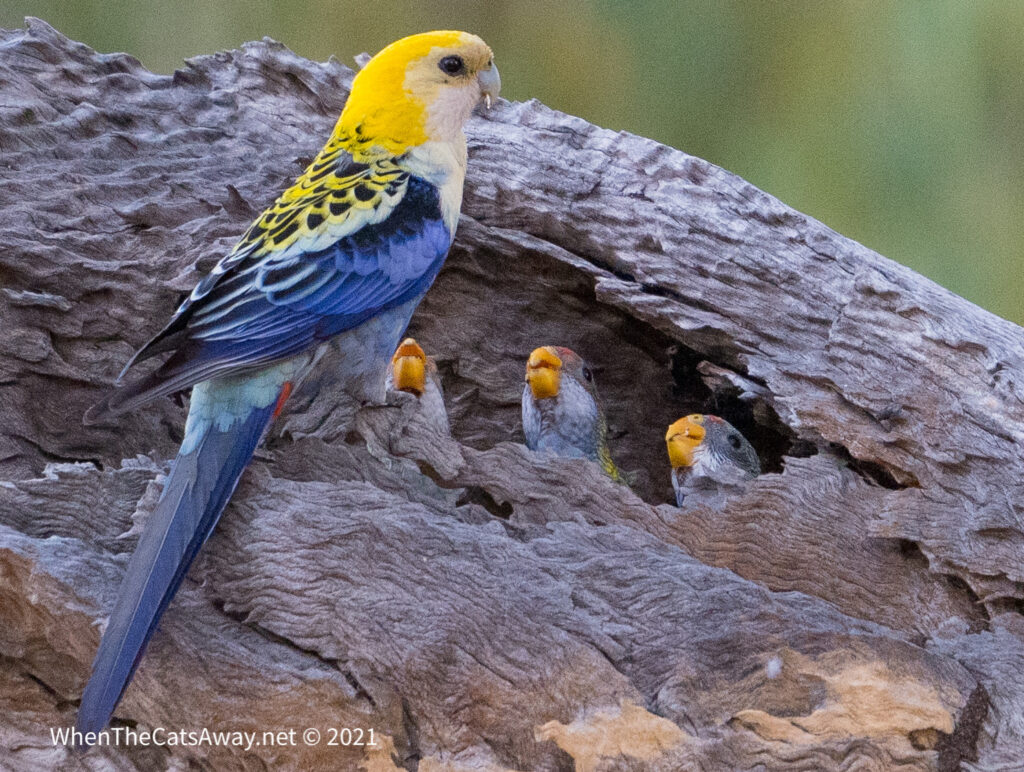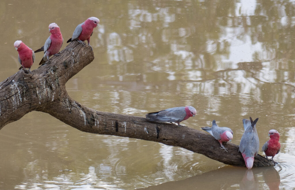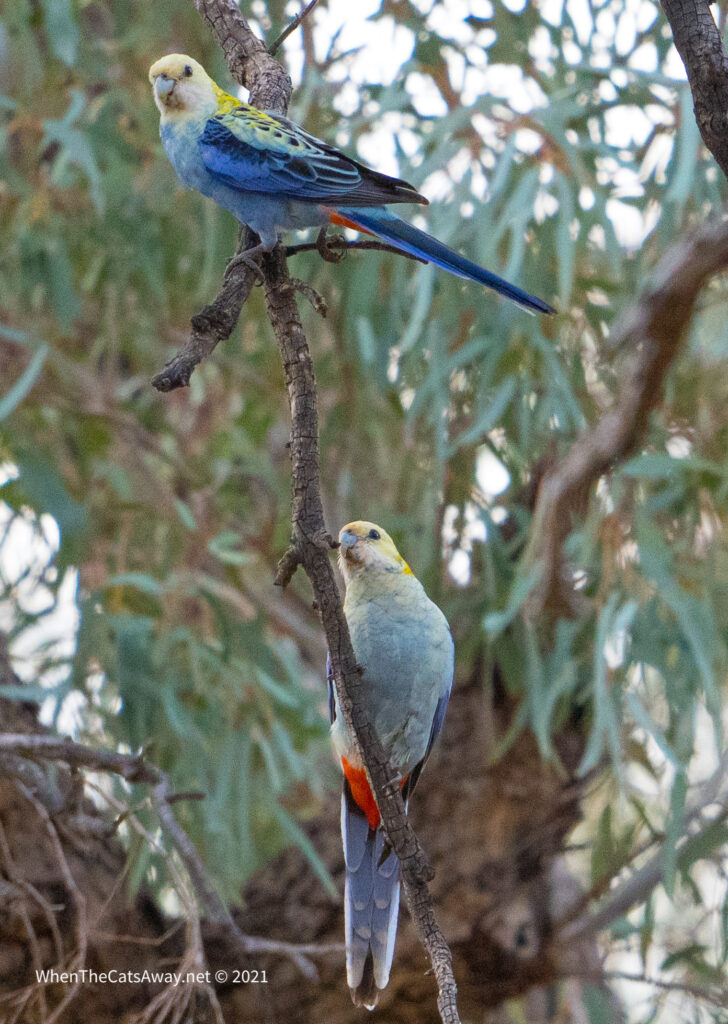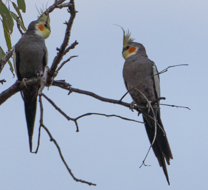 On the Warrego River Walk we felt very privileged to see a pair of Pale-headed Rosellas feeding their hungry family – just metres from people out for their afternoon stroll or jog. A few trees back I heard a call I recognised from my childhood, and up in the trees behind us was a flock of Cockatiels, their yellow faces and rosy red cheeks looking so familiar. I much prefer to see them flying through the treetops than captive in a cage.