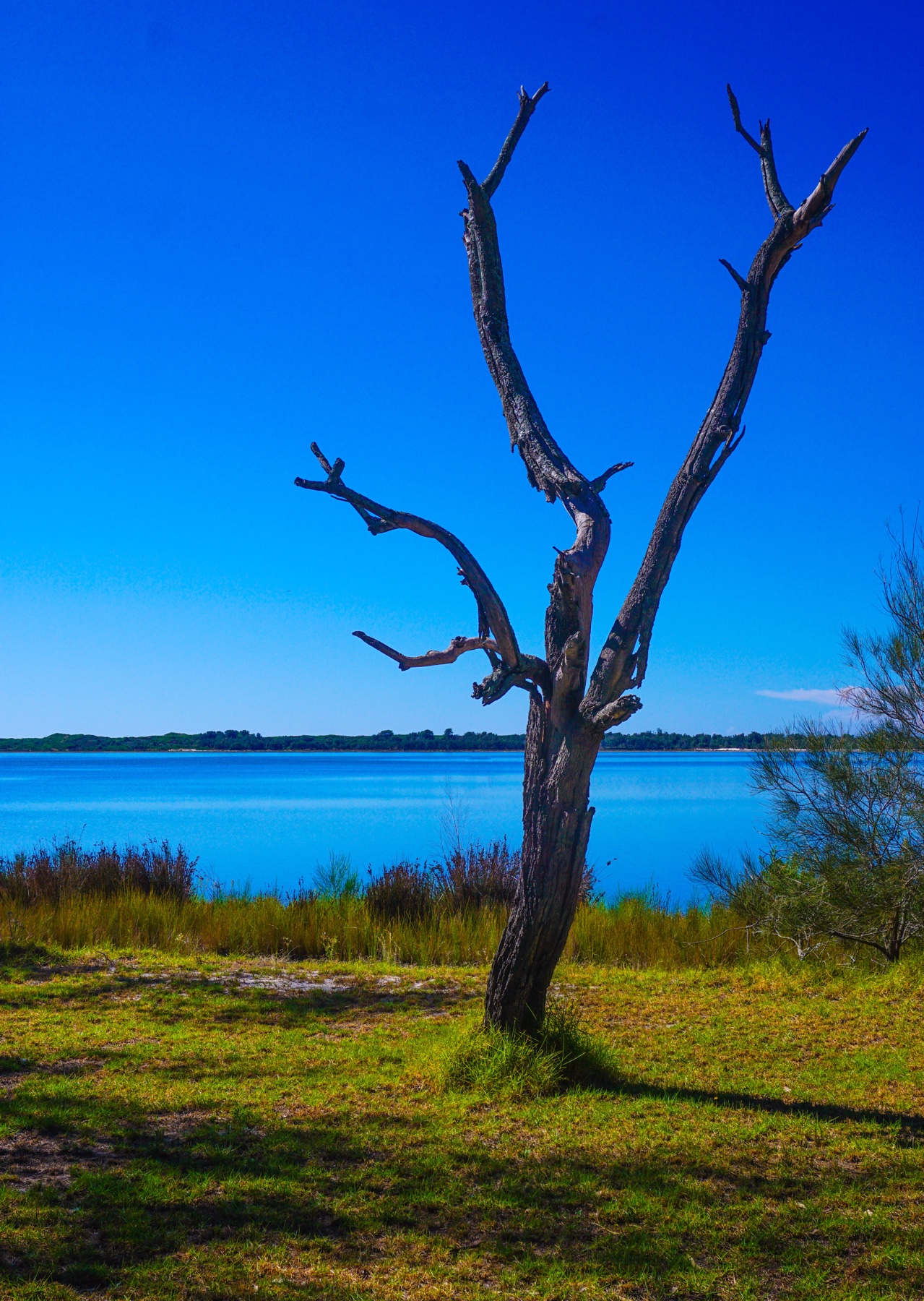 Still perfection – Coila Creek behind the dunesDead tree provides a sculpture alongside the creek