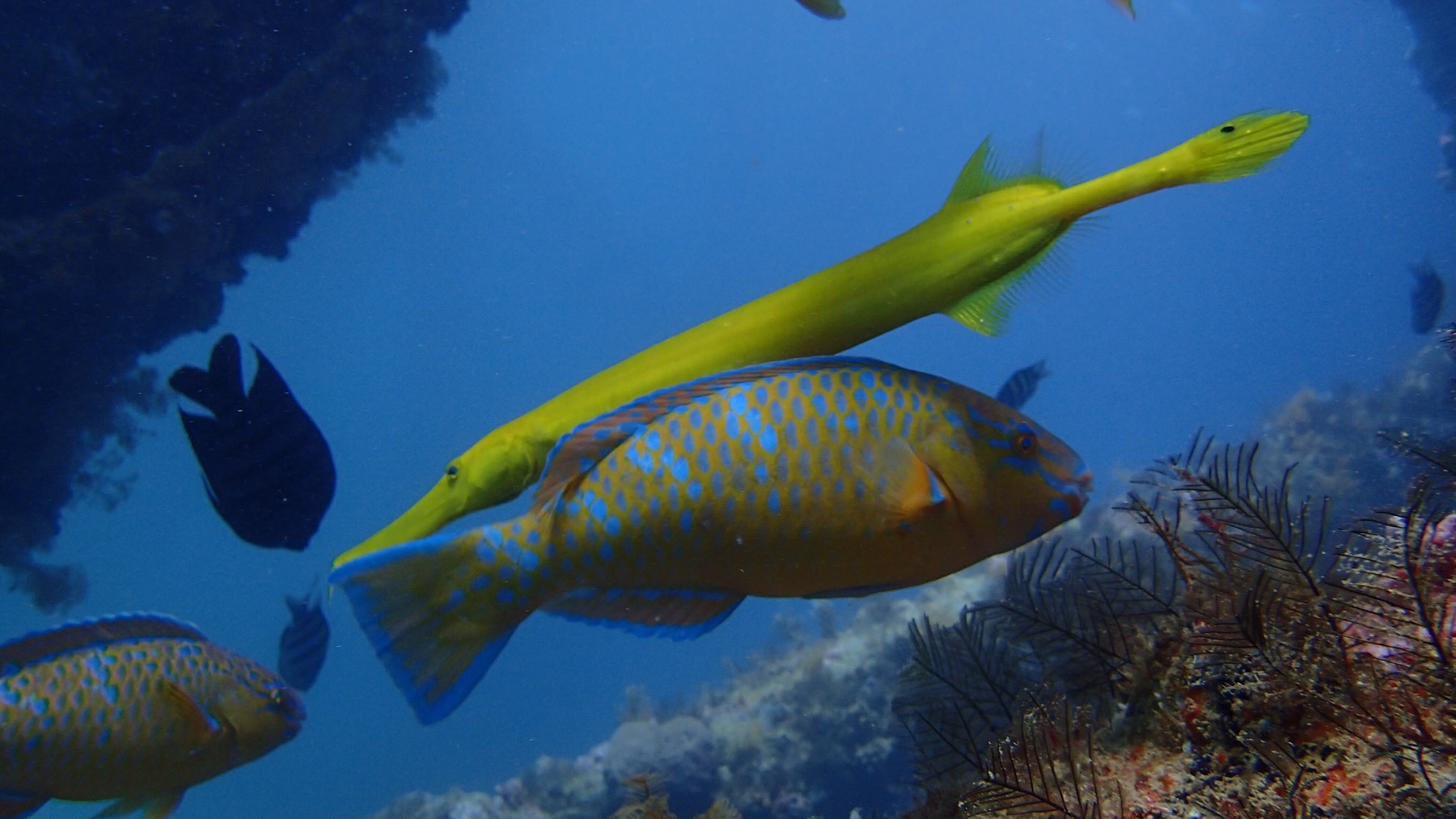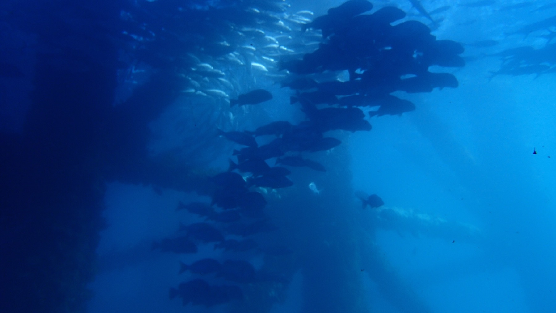 We descended down the line to almost 12 metres below the surface and began our exploration. The sea life was incredible, just like I would imagine swimming in an aquarium. Every surface of the pier’s structure is covered in sponges, corals and fish of every colour and shape imaginable, huge shoals of fish visible everywhere – above, below and beside you as you fly gently through the water.