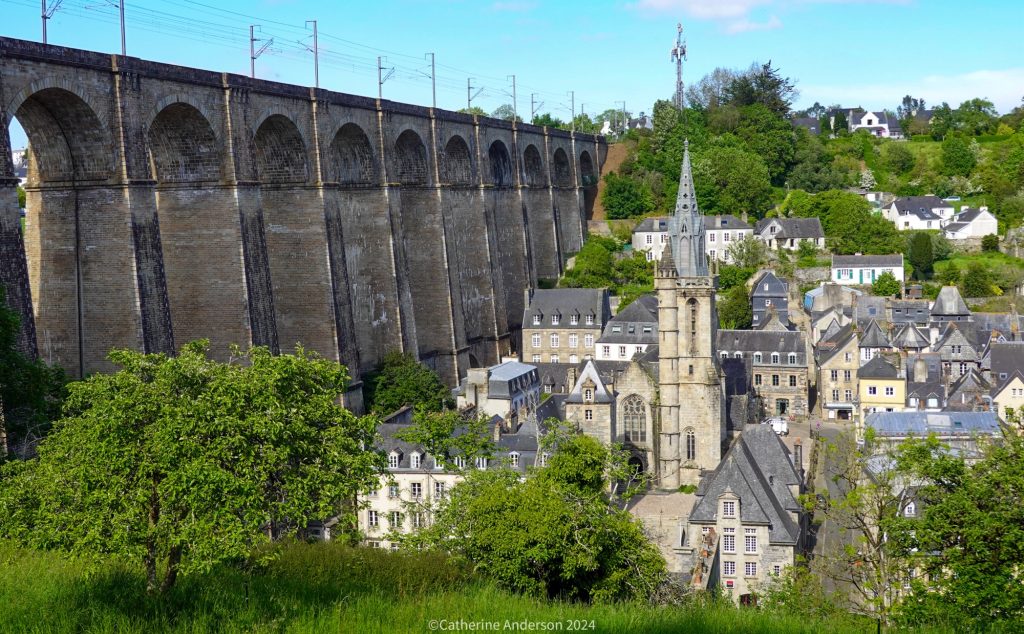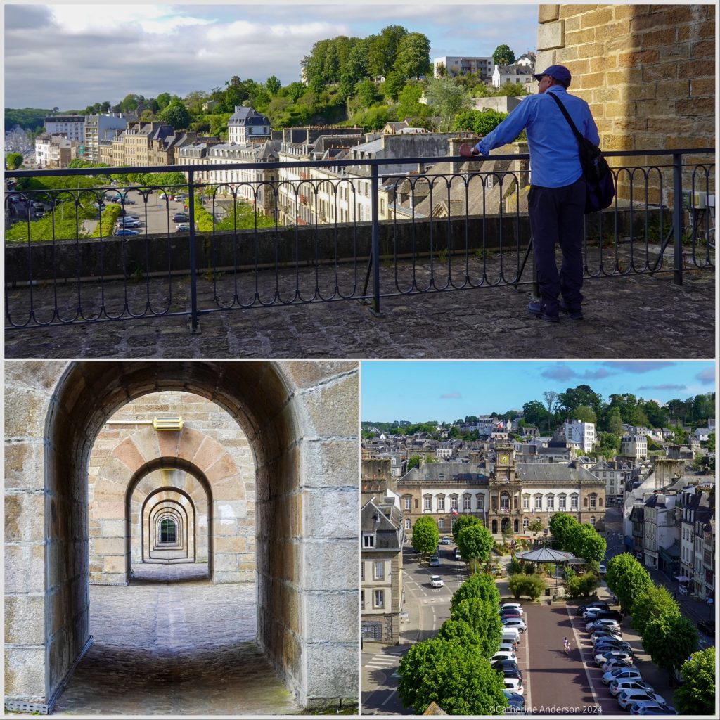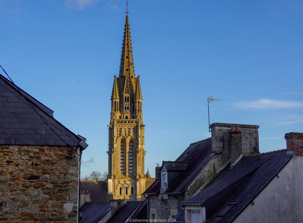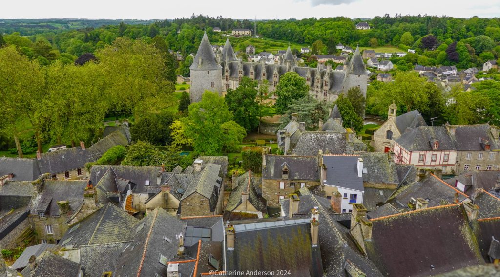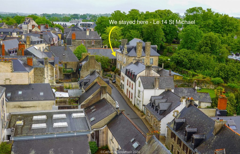 The church is right in the centre of the village, and the last place to see the sun at sunset – as seen from our bedroom windowAnd looking back at our accommodation from the top of the church towerAnd an aerial view of our next destination for the day, Josselin CastleTop: Proof of life – after the exhausting climb up the narrow spiral staircase – Left: looking up into the spire Right: Looking down at the town hall