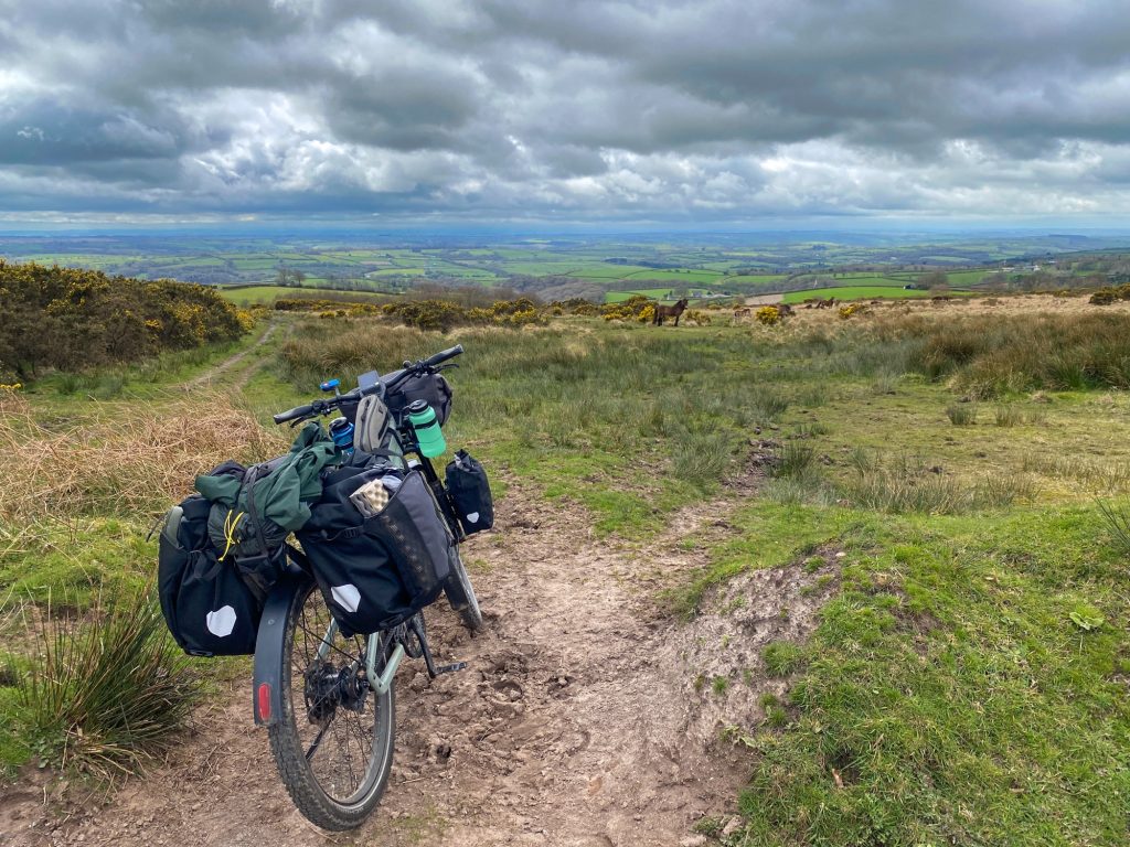 The scenery got spectacular very quickly once I was up out on the tops, still on NC3. It’s called the Ridge Road, and guess what, that’s right, plenty of fine views across Somerset and north Devon. Undulating but manageable, I later found out that I had climbed over a 1,000 metres before reaching camp a couple of hours later. “But you have an electric bike”, I hear you scoff. But it isn’t a moped, I retort somewhat defensively. You do have to actually provide some of the energy. I looked at the stats later and it would seem to lug a 33 kilo bike with around 15-20 kg of gear, food and water a kilometer up, the bike was providing two thirds of the effort, and me the other third. That third felt hard.
