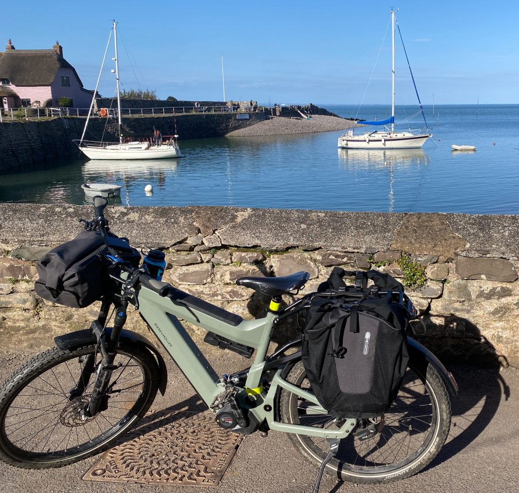 Brutus was up for an early start, so all packed up I pushed the ‘on’ button…and waited…not like him to be tardy…nothing. Absolutely dead. After some fiddling around I worked out the larger of his two batteries had what the manual called in German “Zee bad message” – the flashing lights of doom. Poor lad. Now it’s Sunday morning, early, but just in case I sent a text to the bike shop mechanic I bought it from (EDEMO) and got a message stright back! Amazing people there. They talked me through a couple of checks and it was no go. So unloaded my gear, stored by the kind campsite folks, and rode the slightly more spritely fellah towards home on the little battery. I needed a recharge though, lunch beckoned in another little fishing village called Watchet.