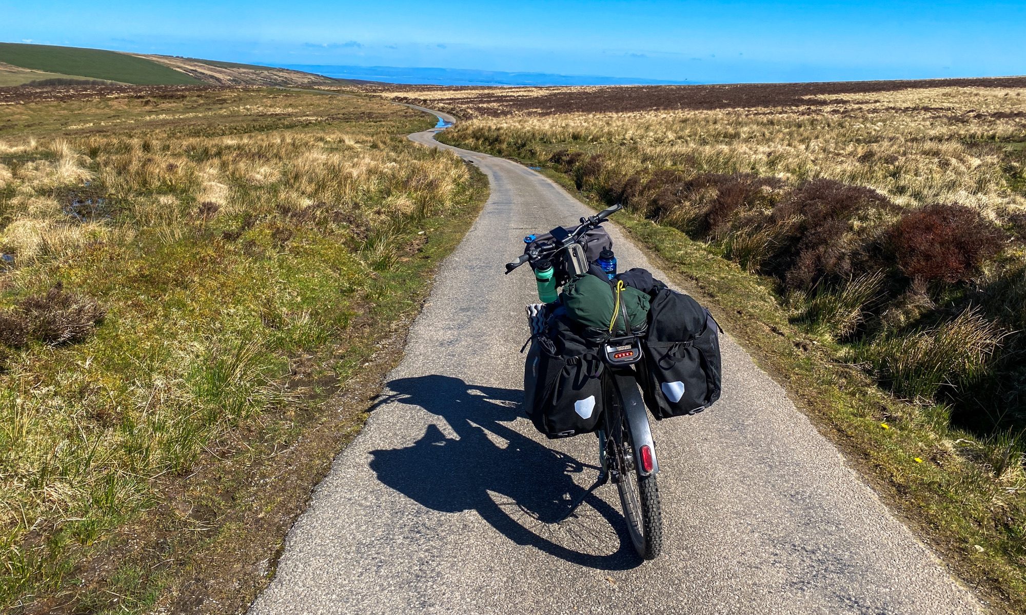 There’s only one cafe in town and I made my usual offer to “pay for power” along with my food. No one has ever taken me up on it, until now. I found £4 had been added to the bill, with no discussion of amount. Quite cheeky I thought. Anyway, off I pottered after a breakfast fit for “used to be a champion, now just an old man on a bike”, and stuck Brutus into turbo for the infamous steep climb up onto the moors. I have no shame about using the “I’m no hero” lowest gear as well. I didn’t weigh my camping gear, but there would have to be 15-20 kg with clothes, food and water. Brutus’s fighting weight with the dual batteries…32 kg. He’s no flyweight.