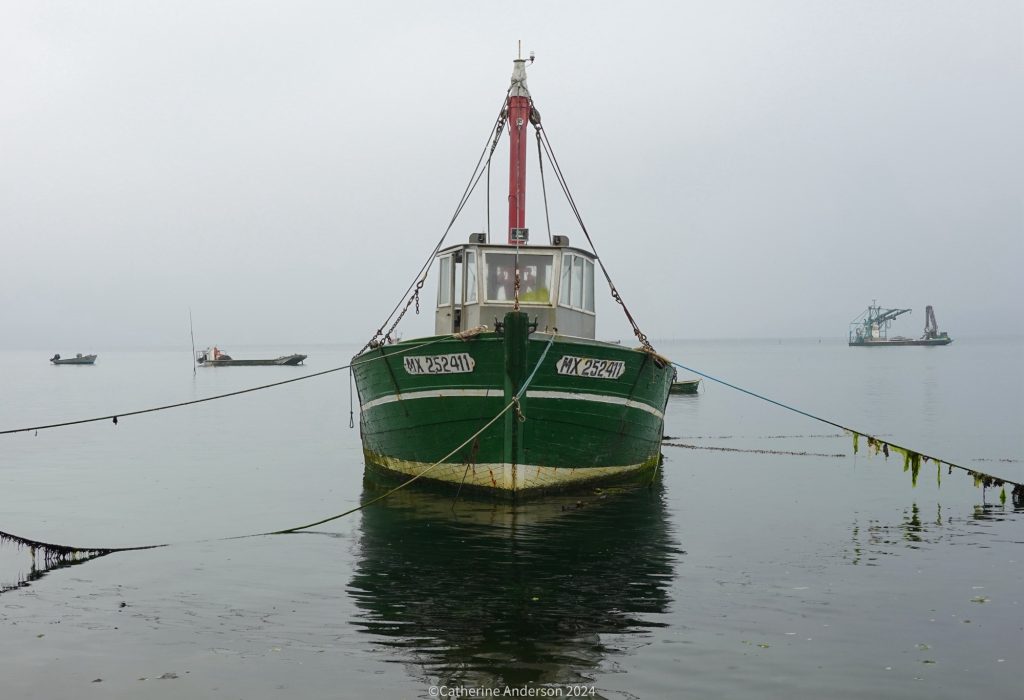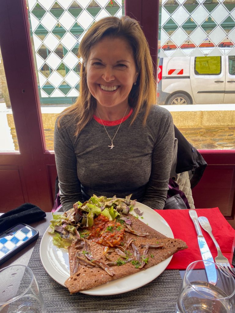 Our hostess loaned us drying rack which we left undercover while we explored the small town and found ourselves some lunch. Brittany is well known for its buckwheat crêpes, both sweet and savoury, so we found ourselves a local cafe with lunch specials, and settled down. The crêpes are usually made with butter, but I asked politely and the chef used oil for mine instead. It was very delicious and light, served with cooked tomatoes, anchovies and salad.