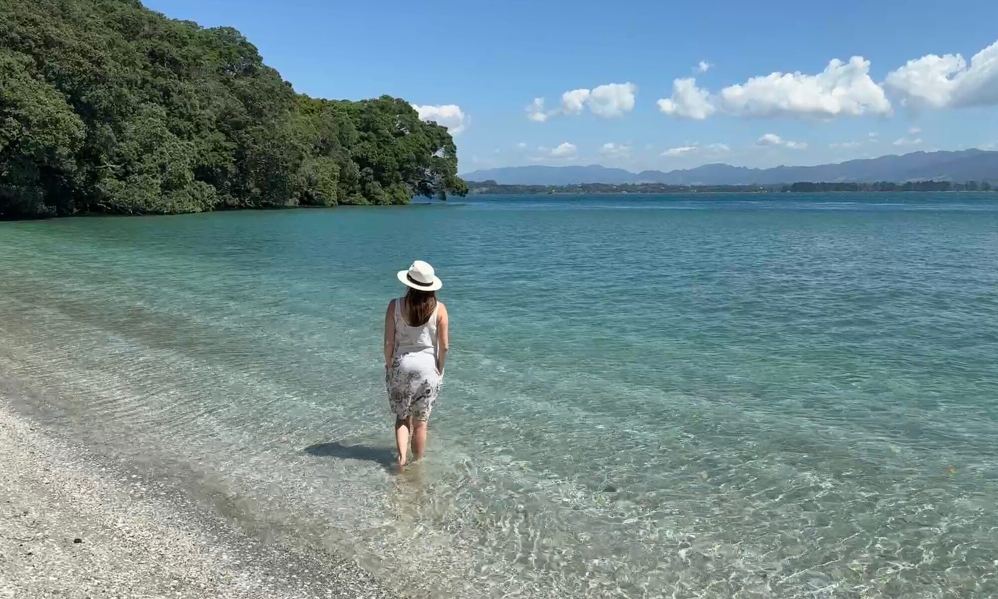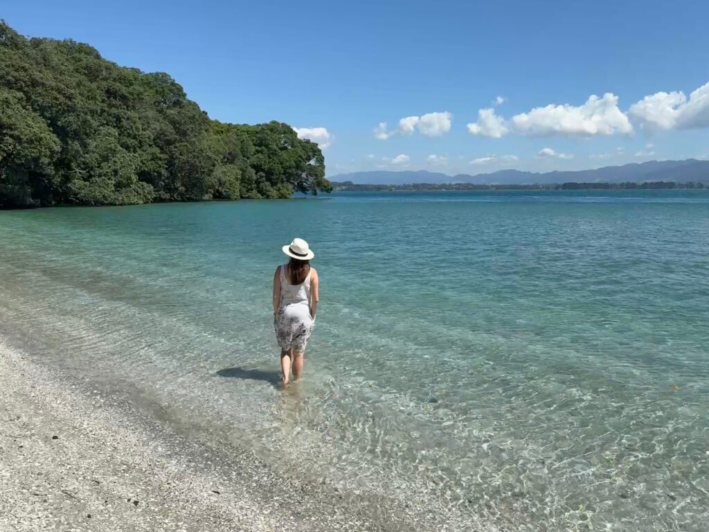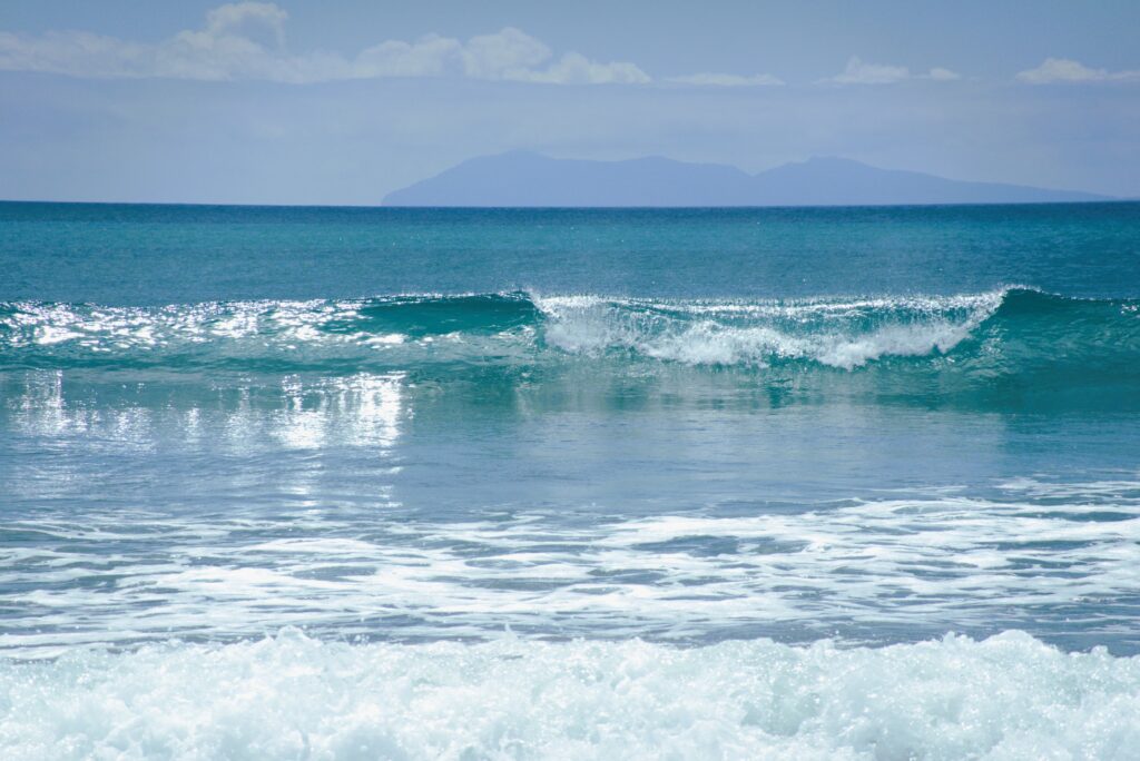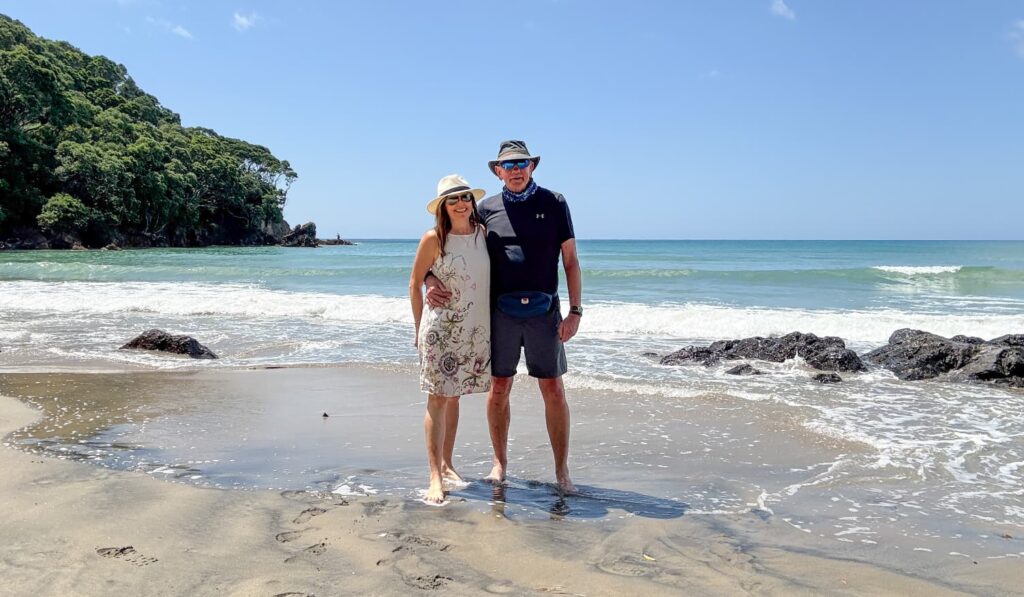 Relief from the scorching sun under the canopy of tree-fernsA very friendly and curious North Island Robin joined us through the forest walkAnother day we visited Waihi Beach near where Dad and Sue used to live – endless white sand and turquoise watersA wave breaks with an outlook on Mayor Island/TuhuaMark and I walked over to Shelley Beach near Bowentown, an old favourite haunt – the water was really warm, and it was here we had our first New Zealand swim of the trip