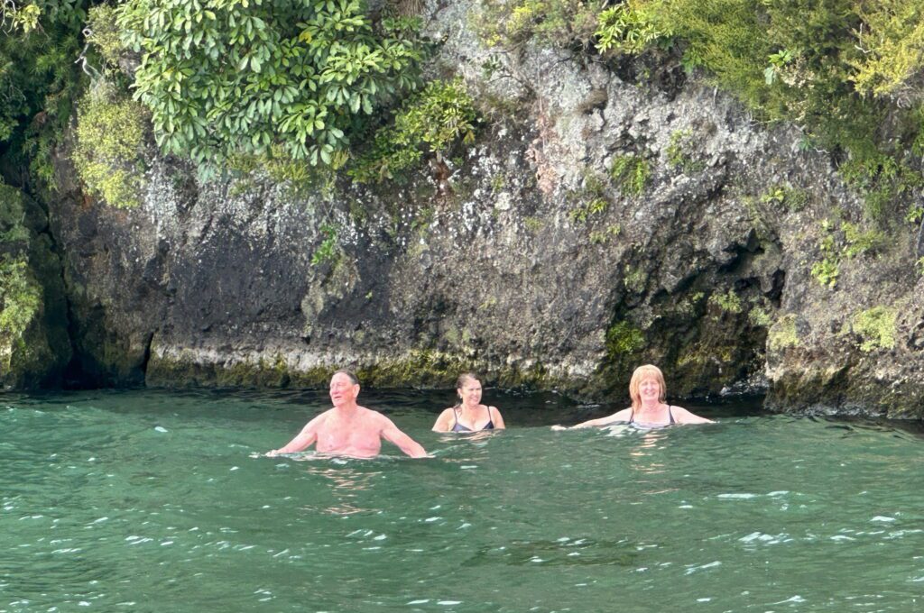 Our friends Jenny and David drove over from their home in Stratford to join us, generously also put up by Vicki and David, and joined us on another boat trip on the lake. The conditions were perfect and David and Vicki took us to where the hot springs fed into the lake warming the sand and water perfectly.