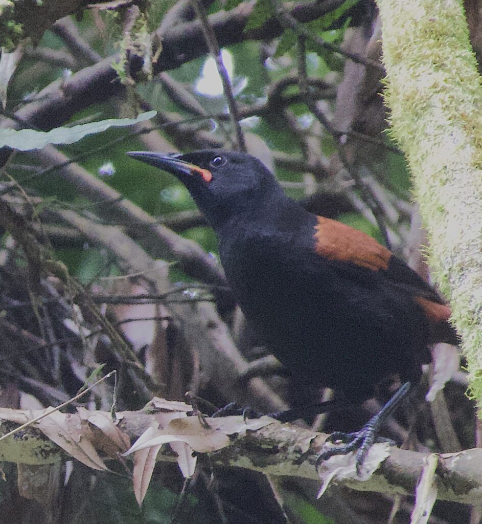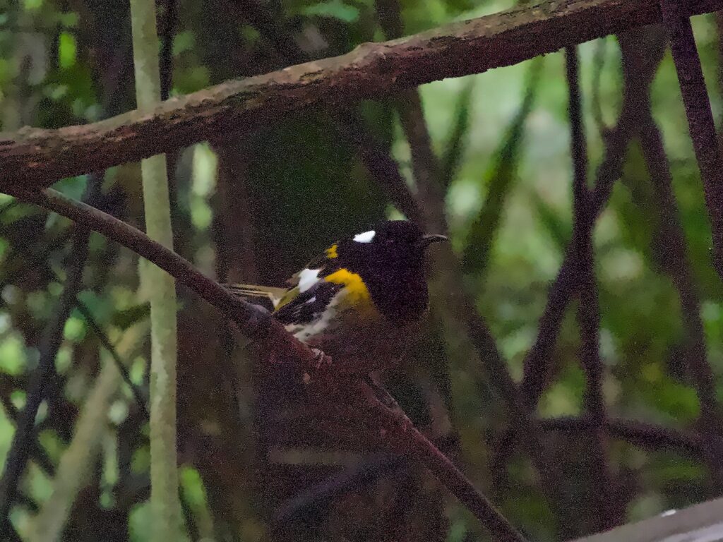 A rest point along our circuit hike, over looking Rotokare LakeA saddleback (tīeke)North Island robins (toutouwai) were plentiful and always posing for a photoA stitchbird (hihi) – they’re pretty hard to see in the darkness of the undergrowth and like to feed on nectar