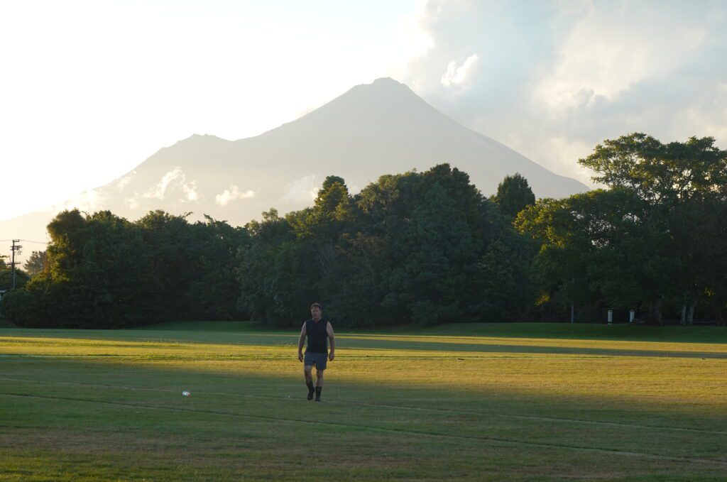 David crosses the playing fields across from their home as the clouds drift away from Taranaki