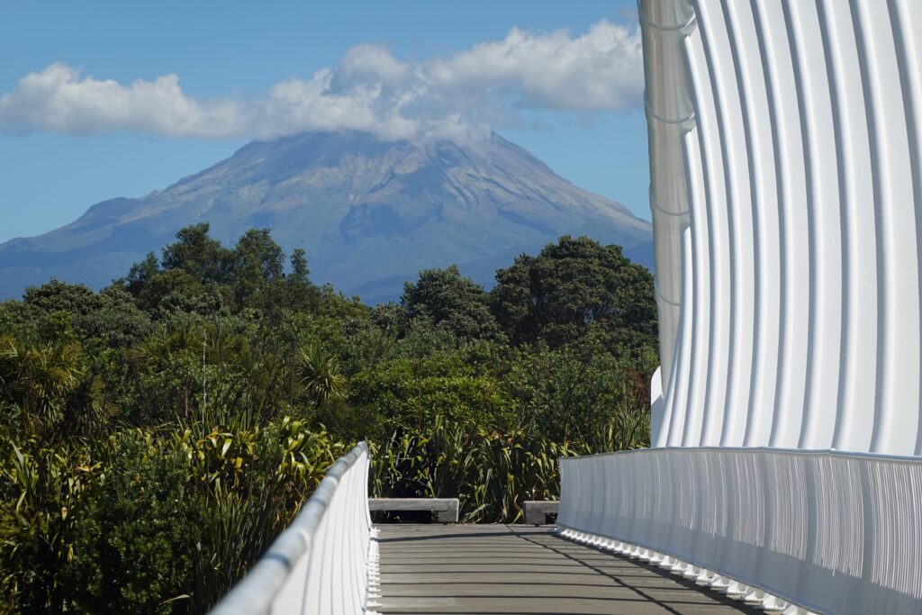 Considered active, Taranaki will one day erupt again. It erupts every 150 years on average – it has been 160 years since the last one…We can see for many miles from the lookout on TaranakiMount Taranaki once again shows itself as we cross the Te Rewa Rewa Bridge on the New Plymouth coastal walkway