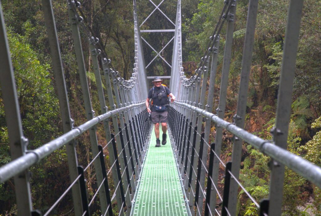 An eel emerges from rocks on the Arthur RiverThe rediculously stunning Mackay Falls was a highlight on day 4Crossing over one of the many swing bridgesThe Arthur River and Lake Ada, looking calm and moody on our final afternoonNo room for vertigo at this stage of the walk! This path was chipped out by hand by former minersThank goodness for those two hiking poles