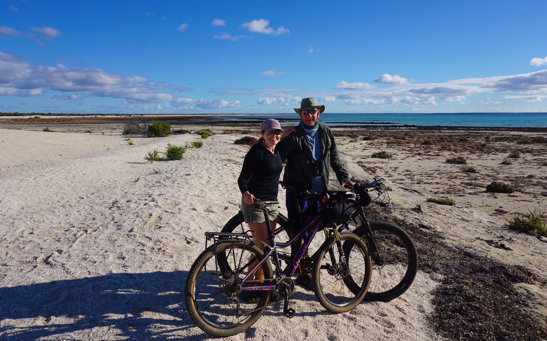 Now, we had no idea what stromatolites were, so on spotting a sign directing us to see them, we jumped on our bikes and headed up to Hamelin Pool. As we rode down onto the beach and boardwalk we spotted Nick and Laura, the couple from Manly/UK who we first met (and last saw) just north of Broome while hunting for dinosaur footprints! On finding they are camped just two spots away from us we made arrangements to catch up for drinks in the evening.