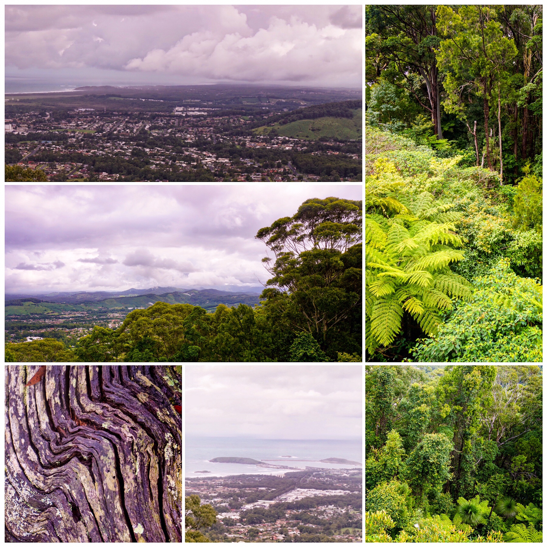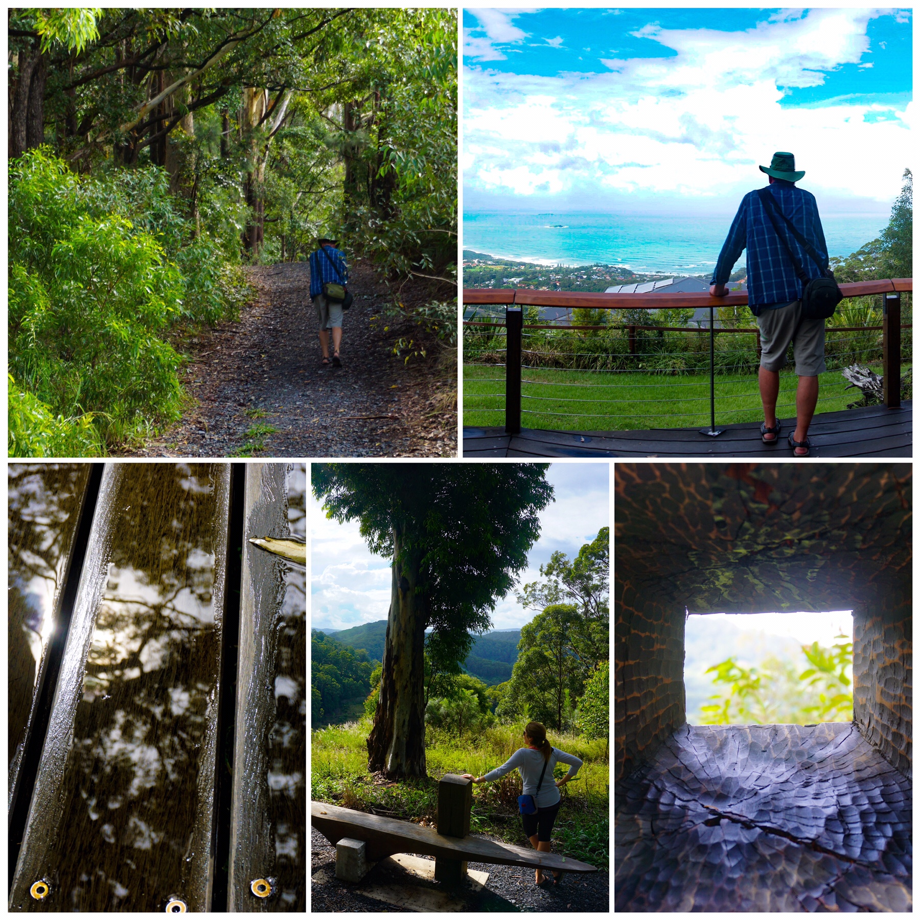 After filling ourself we decided we ought to get out and do a walk, and drove up into the hills behind Coffs to Ulidarra National Park. There we managed a short 3km return hike to the Korora Lookout which rewarded us with views across the region and to the north – a rainforest walk with beautiful natural sculptures telling an Aboriginal story.