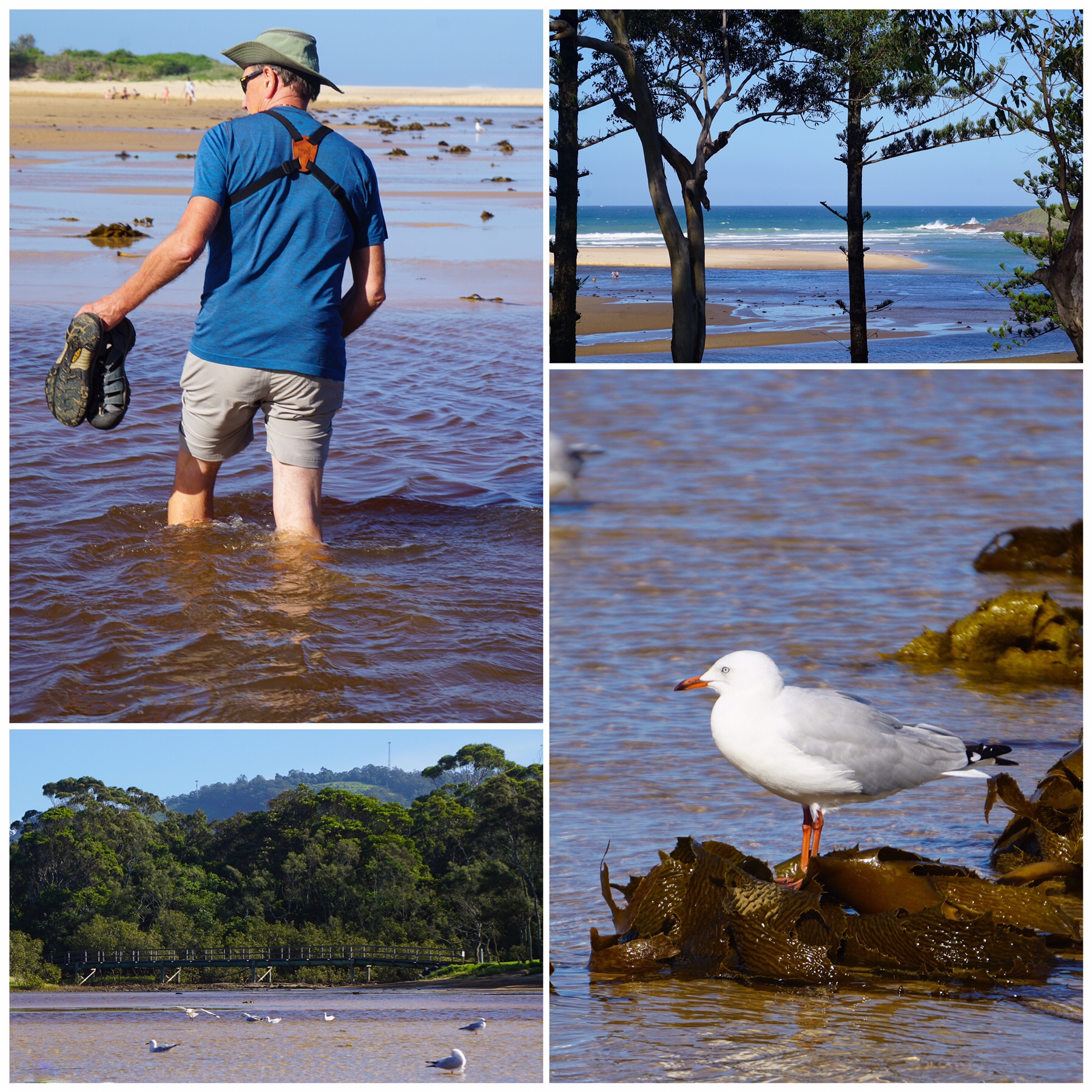 The afternoon was too breezy to get the boats out again, so we went for a stroll down to the water from the campground. It’s such a picturesque area, with the campground sitting up above the estuary of Moonee Creek, offering views across the water. It was approaching low tide, so we were able to stroll across most of the creek through its warm waters.