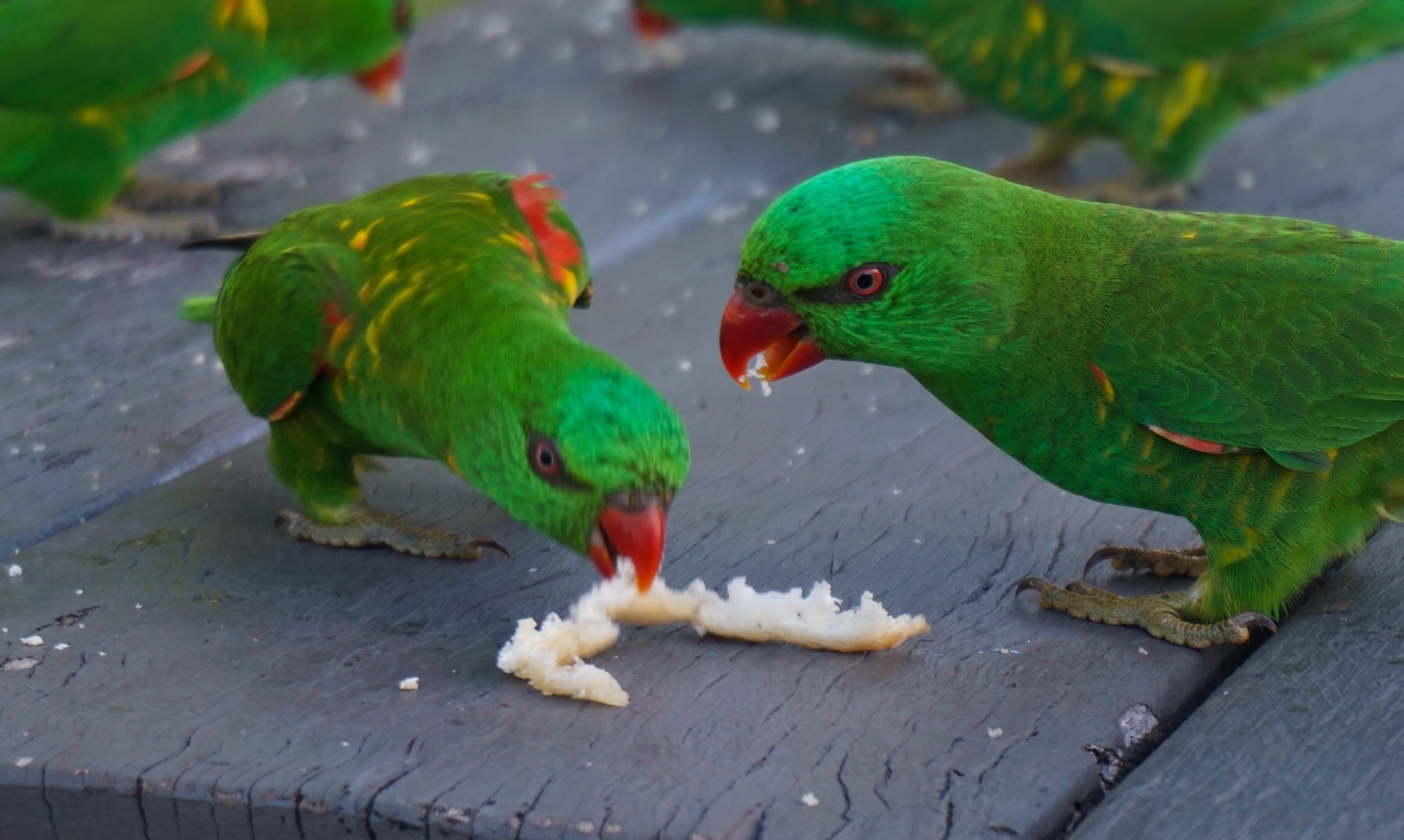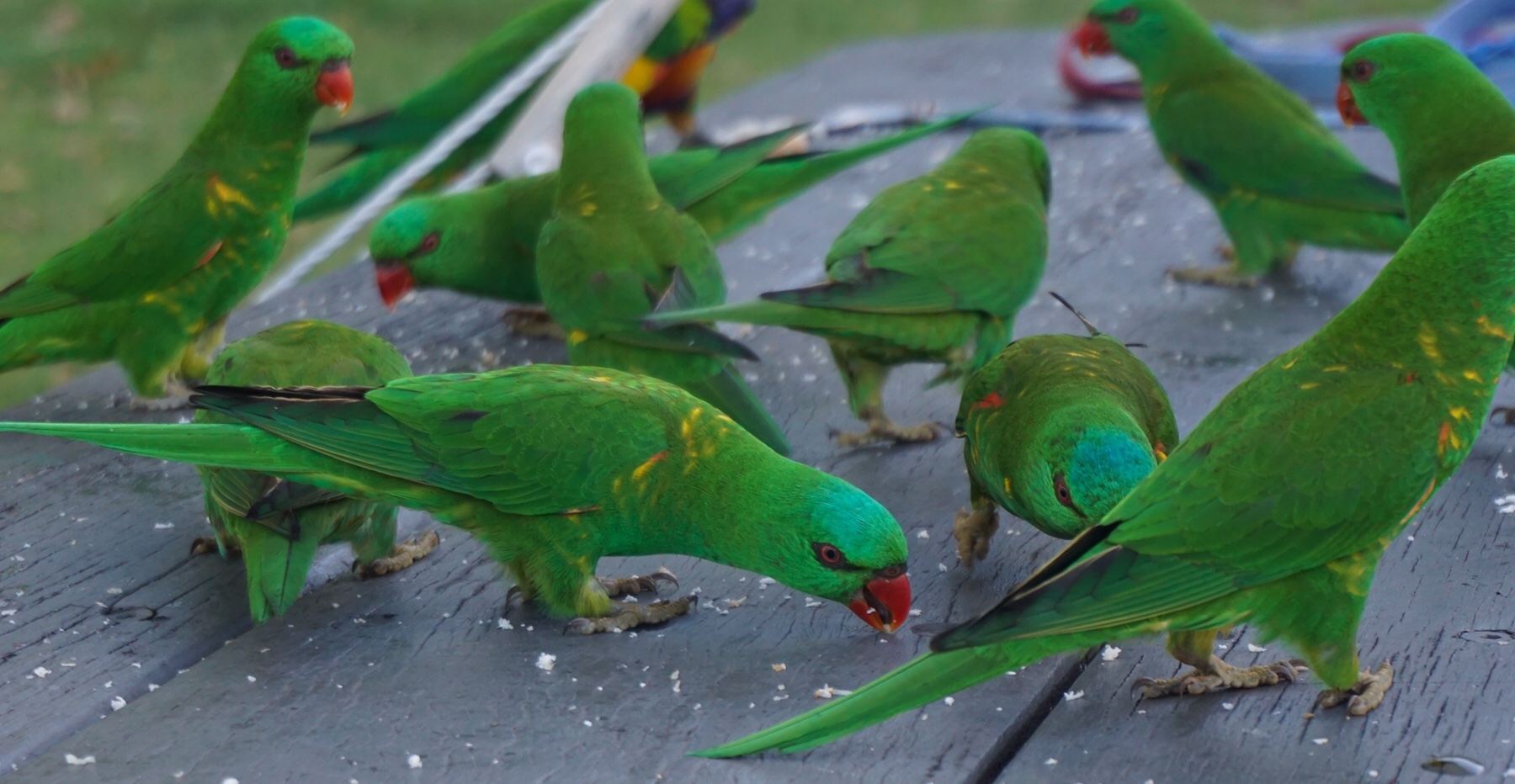 This is such a special part of the coast. We wished our family in the UK could be magically transported here – the children would love playing in the sandy shallows, and there is so much to do and see. Some people staying on the site were feeding the lorikeets with honey and bread [below: Scaly-breasted Lorikeets]