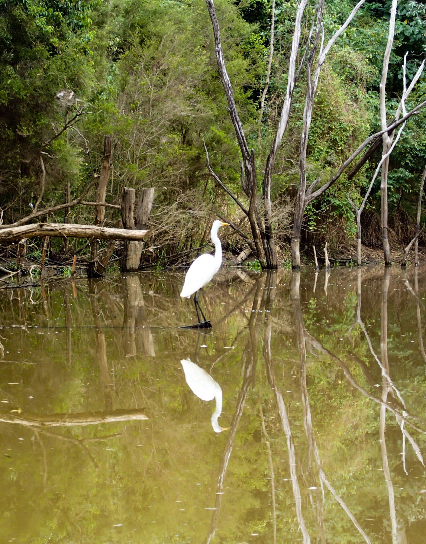 Well we didn’t see them but we did a multitude of water dragons, looking pretty silly as they do bobbing along on their stumpy legs, then a bright blue azure kingfisher darted in front of us and landed on a branch with one eye on his next breakfast morsel and one eye on us. An Eastern Great Egret stood regally admiring his kingdom, what a majestic bird.