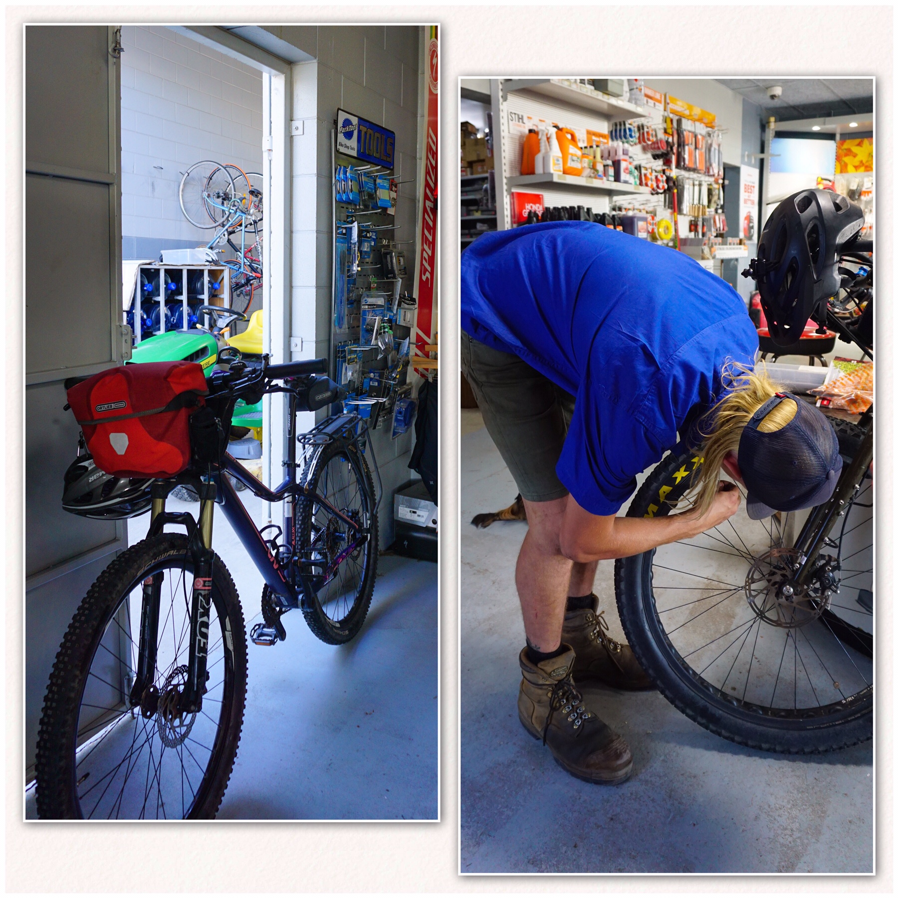 We jumped off the tarmac and enjoyed a short ride though the bush, until Catherine felt her tyre go flat! She’d picked up a bunch of thorns, so it was off to the local bike shop, which doubled as a purveyor of power tools! The dedicated bike shop that was here has now closed down, sadly an all too familiar story around Australia.We had some stuff to collect from the local Post Office, and as usual it had arrived safe and sound. Using this system of sending our various care packages to a Post Office on route has been brilliant. They will hold it for up to a month free of charge, as long as Australia Post is the courier and not a third party.
