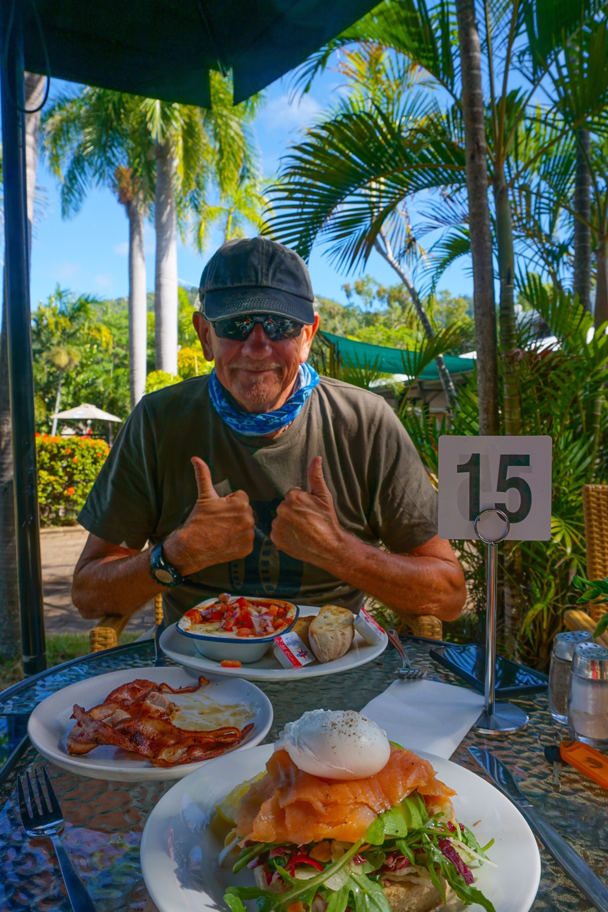 We headed off from Nelly Bay to find breakfast. We had been recommended a place in Arcadia called the Bikini Tree, and settled ourselves in. A salmon stack for madam and a baked egg dish for me, both cooked just right.
