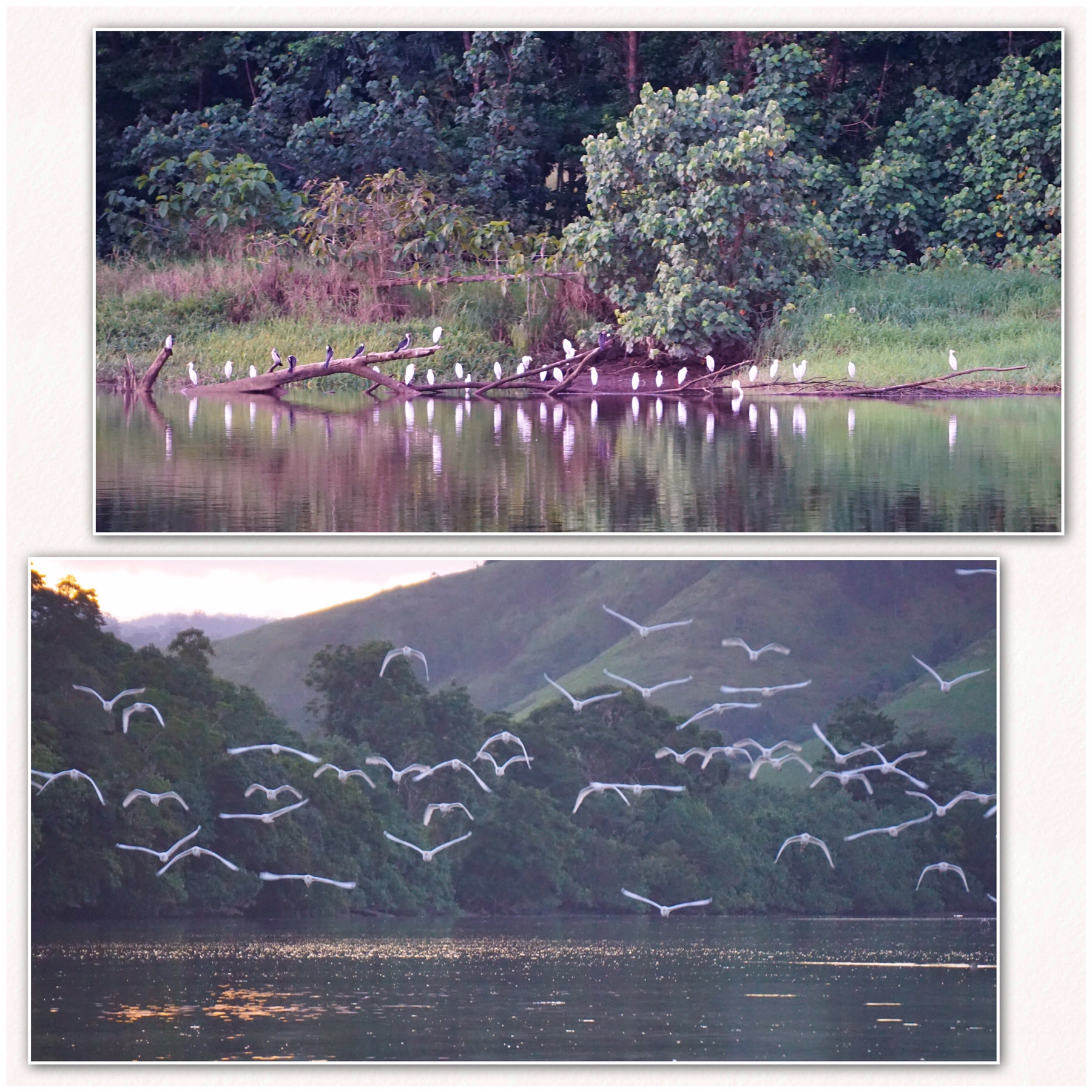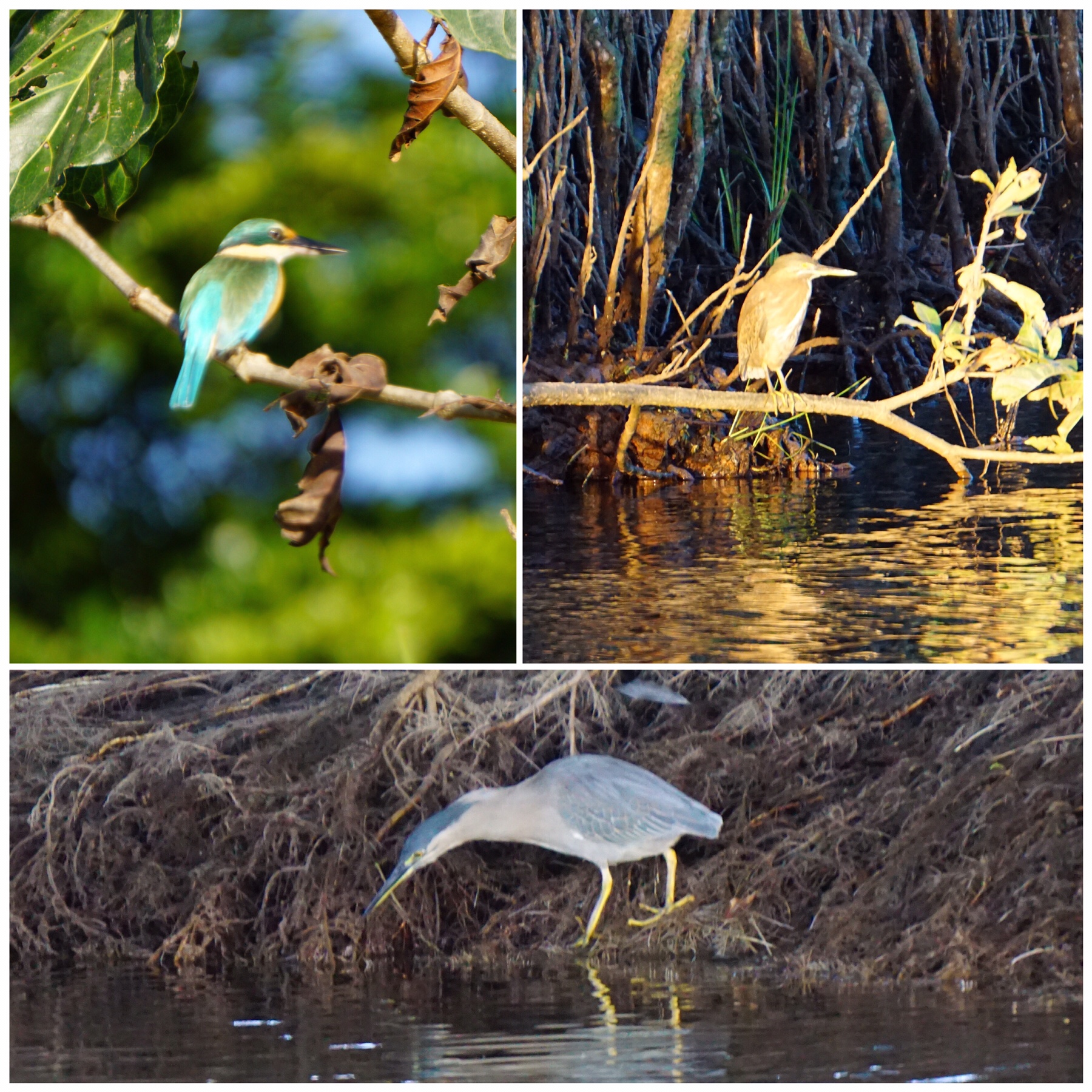What a cruise. Not just the birdlife (to name a few we saw Striated Herons, Wompoo Fruit Doves, Great Egrets, a beautiful Sacred Kingfisher, Rainbow Bee-eaters, Sunbirds, Spotted Catbird…) but the stories of other wildlife (the snakes, the bats, the crocs) and the flora (Ylang-Ylang tree flowers – the main ingredient in Chanel No 5, the numerous fruits and seeds from the mangroves, the reason for the changing colours of the native hibiscus – yellow on day one, which drops off once pollinated, turning to orange and later a deep pink on further days until pollination is successful).