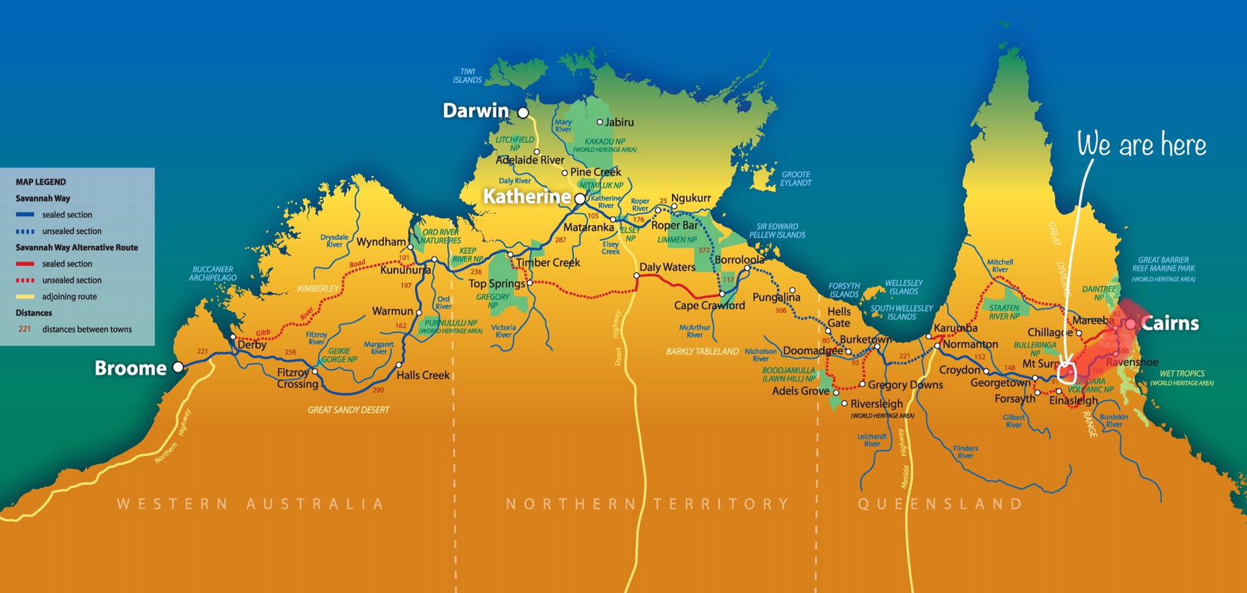 Where are we on our Savannah Way journey? Just a short way along, but a world of difference from Cairns. Off to a new destination tomorrow and a whole lot more red dust!