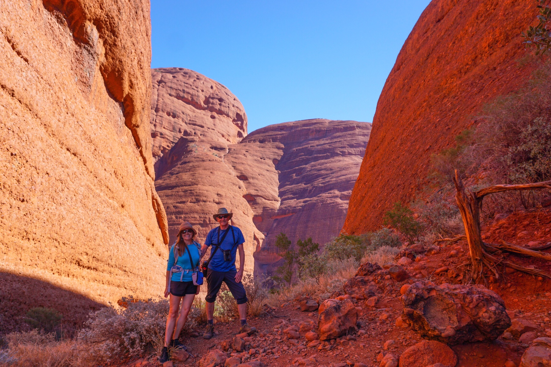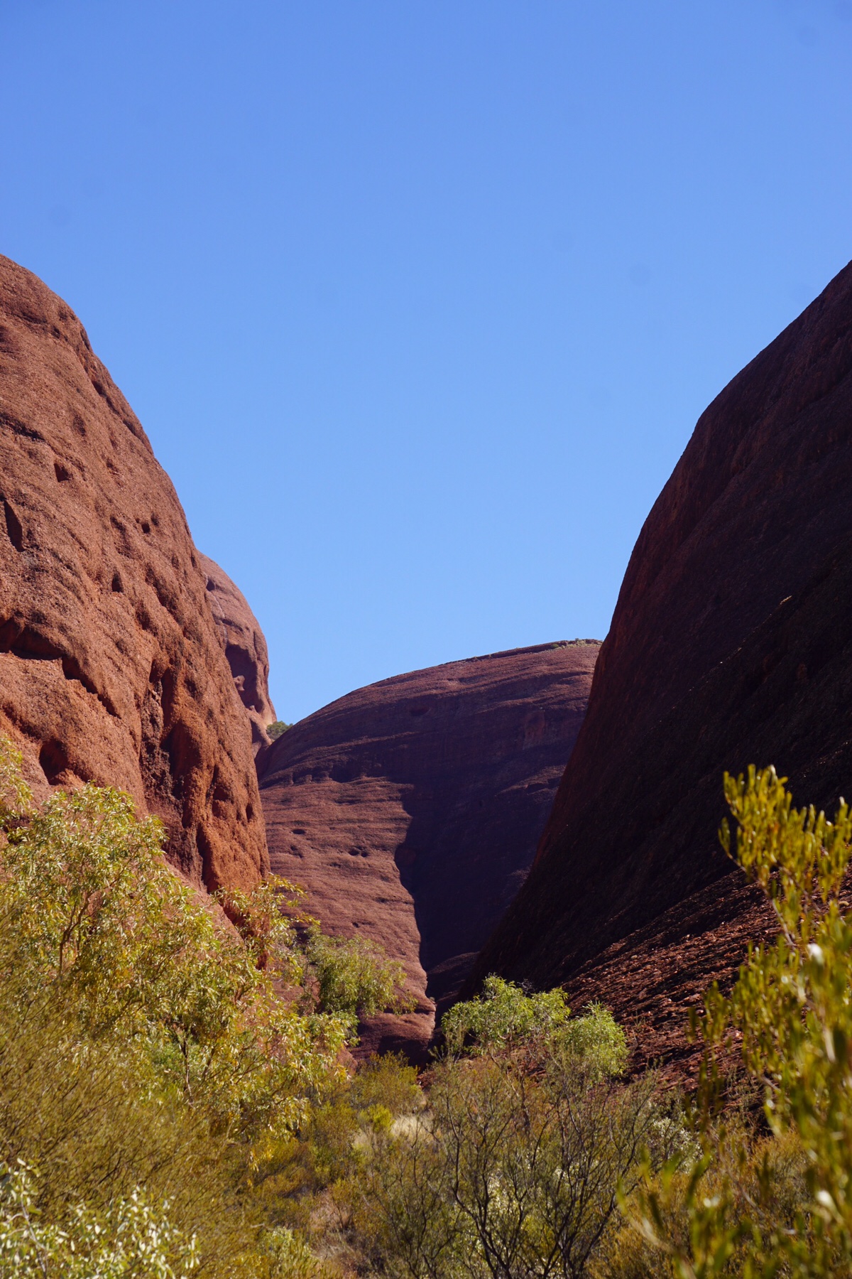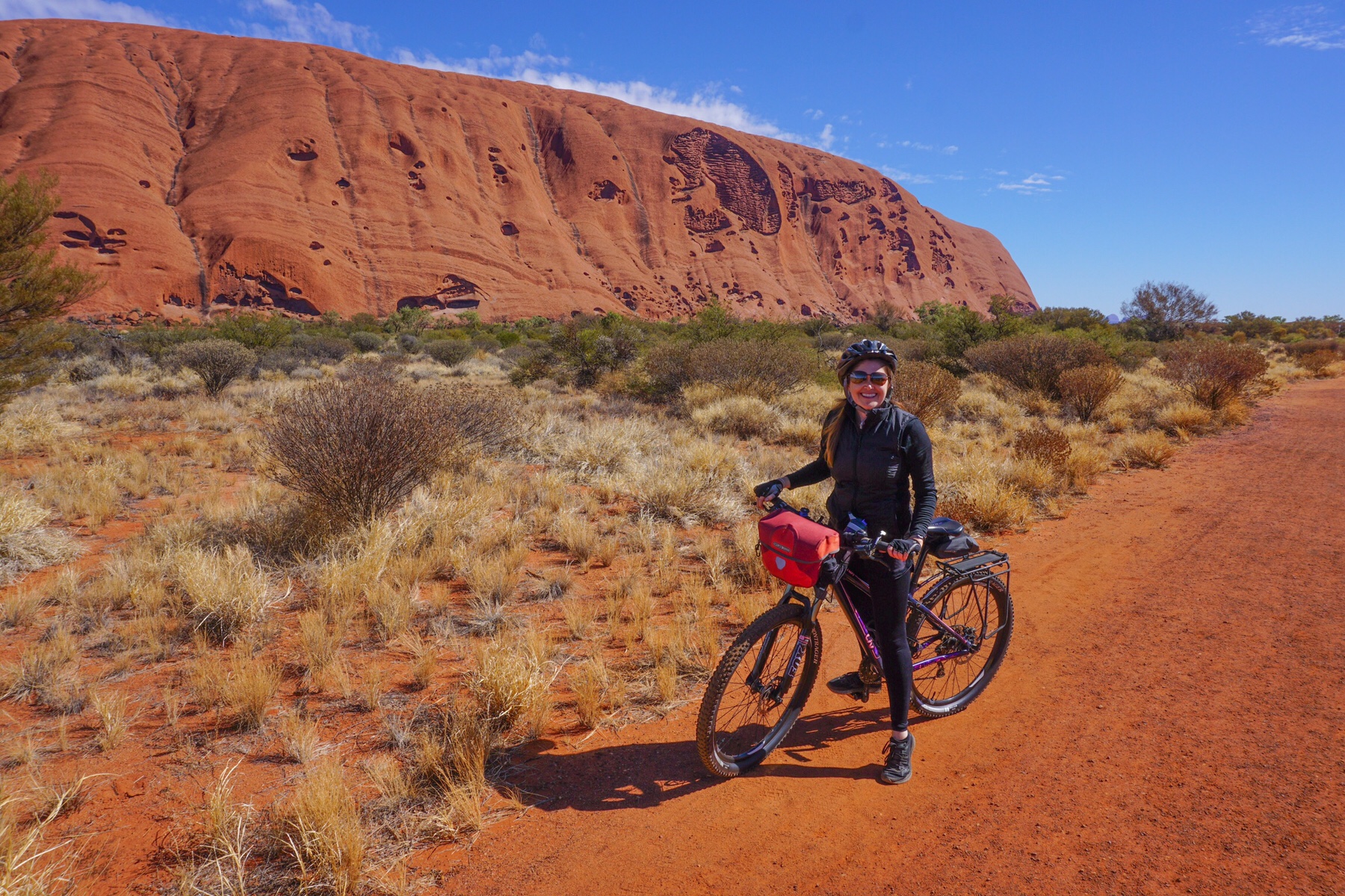 Riding a bike always brings a grin to our faces wherever we are, but to be riding along under this brilliant blue sky, dwarfed by this towering red rock…breathtaking. We just couldn’t stop ogling this magnificent scenery. Neither of us are in any way spiritual, but we both felt this to be the closest we could get, just sitting quietly looking up at this massive granite monolith towering over us.
