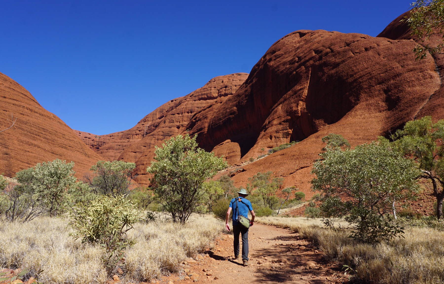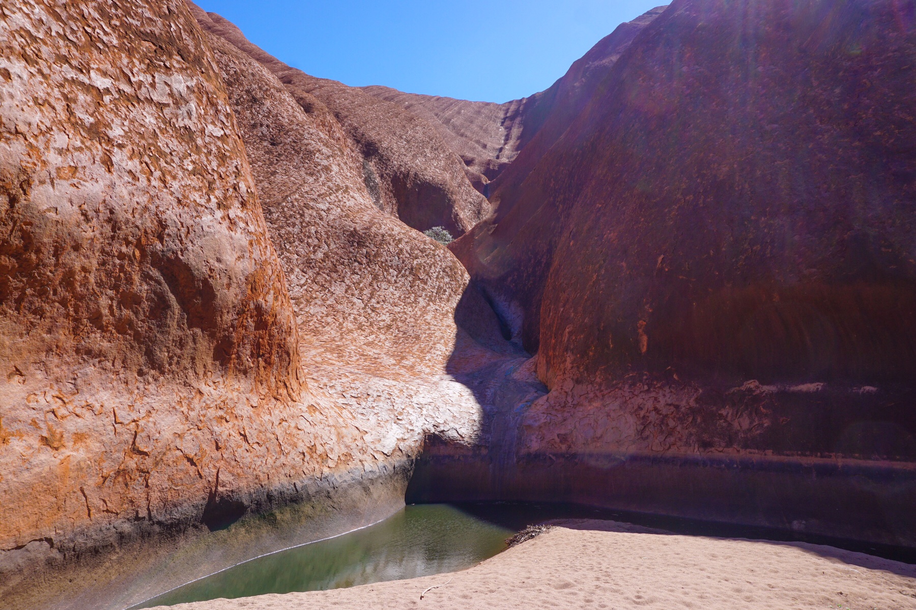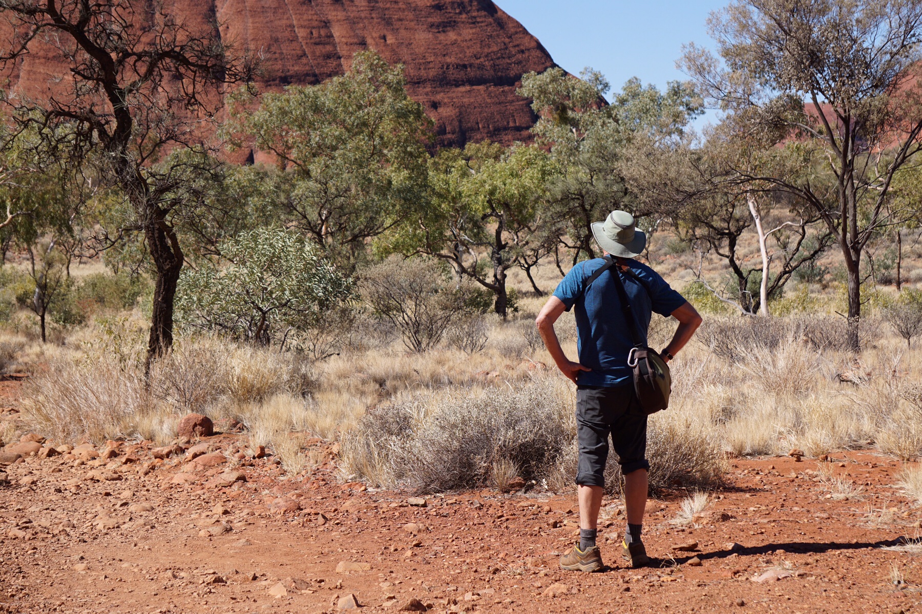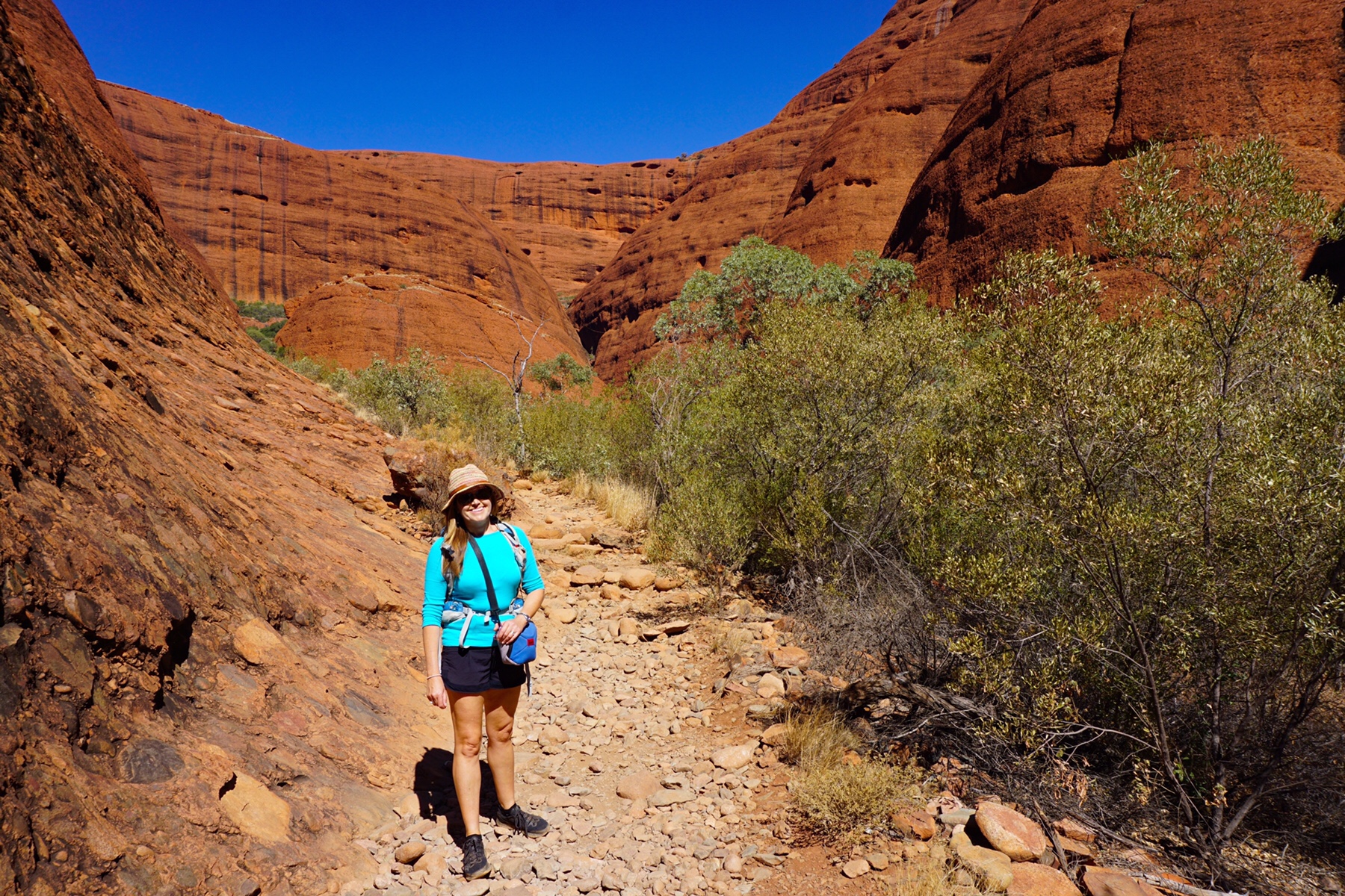 Riding a bike always brings a grin to our faces wherever we are, but to be riding along under this brilliant blue sky, dwarfed by this towering red rock…breathtaking. We just couldn’t stop ogling this magnificent scenery. Neither of us are in any way spiritual, but we both felt this to be the closest we could get, just sitting quietly looking up at this massive granite monolith towering over us.