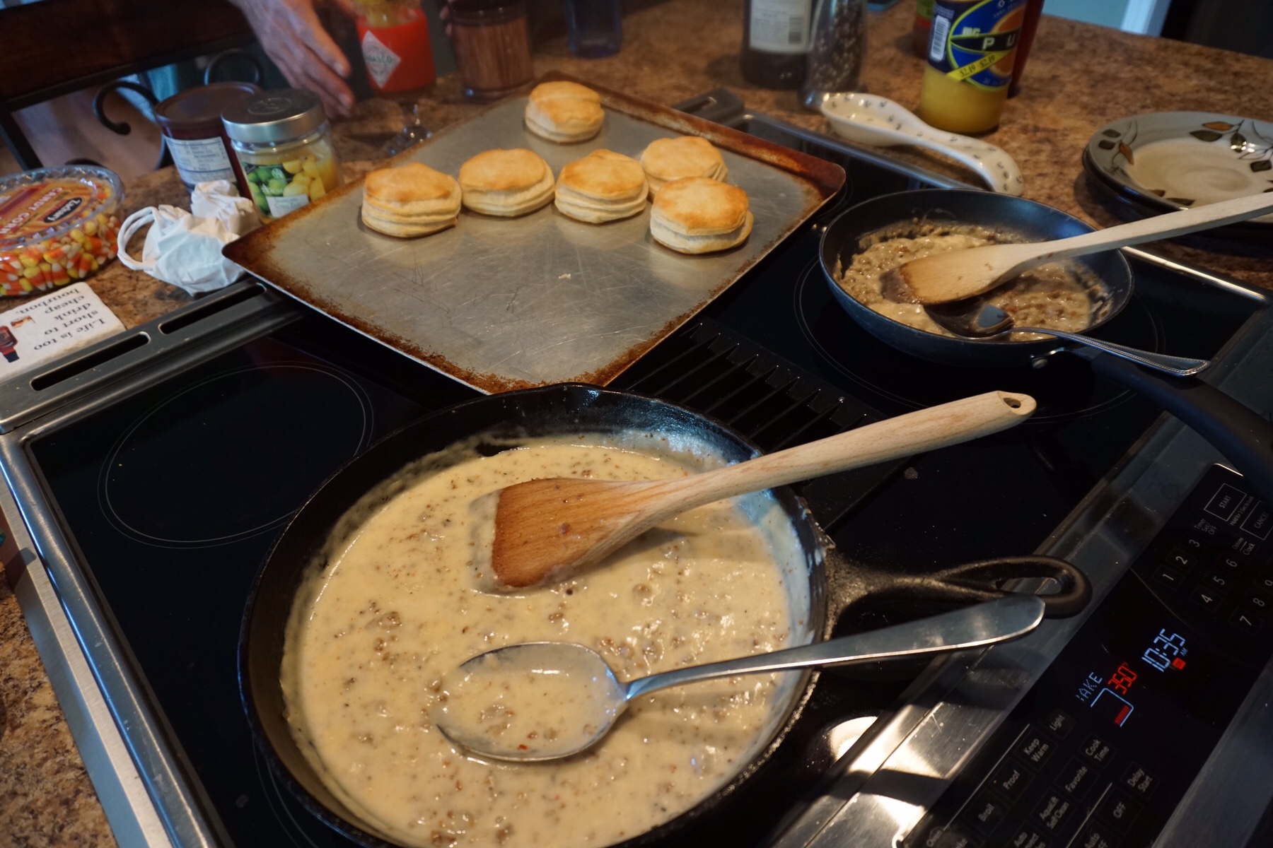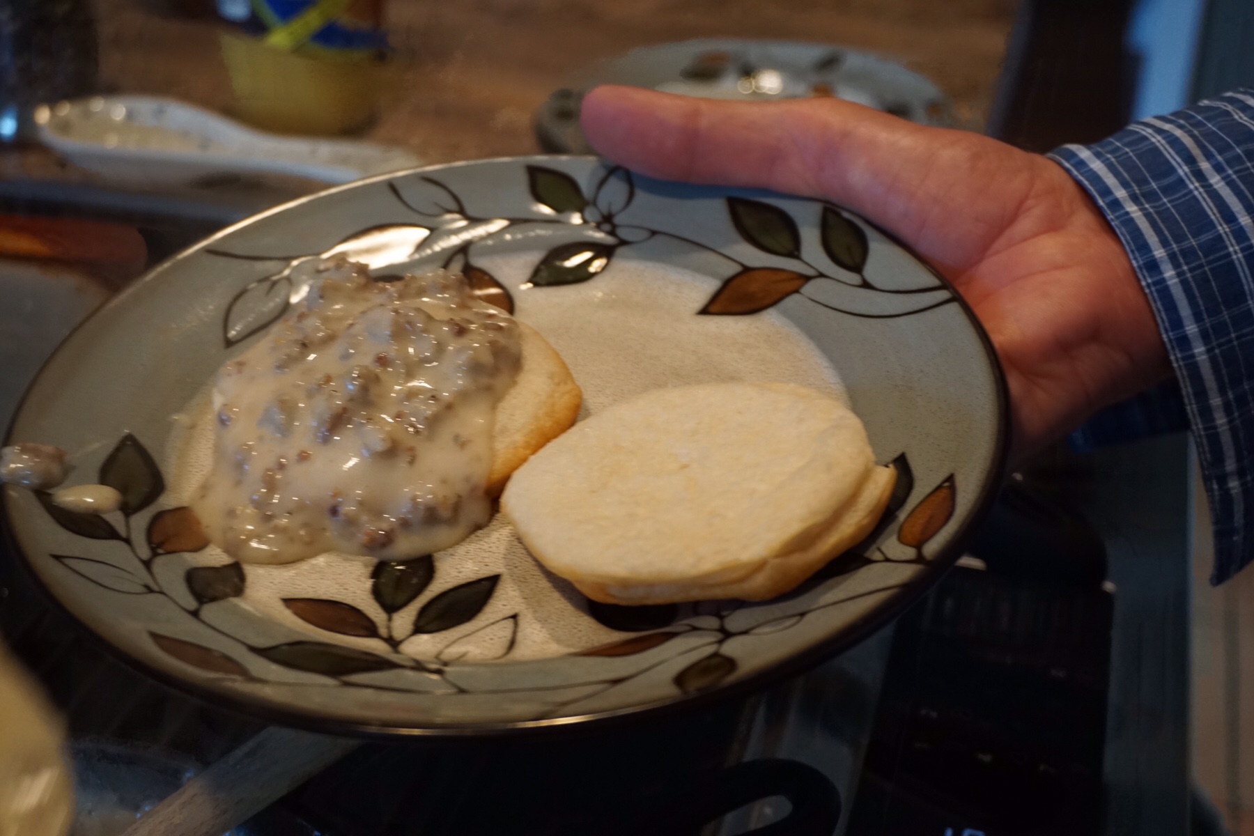 It turns out the ‘biscuits’ are savoury dough circles baked in the oven, while on the stove top a mixture of sausage meat, flour and milk are cooked up. This is served with hot-pepper sauce and is surprisingly delicious!