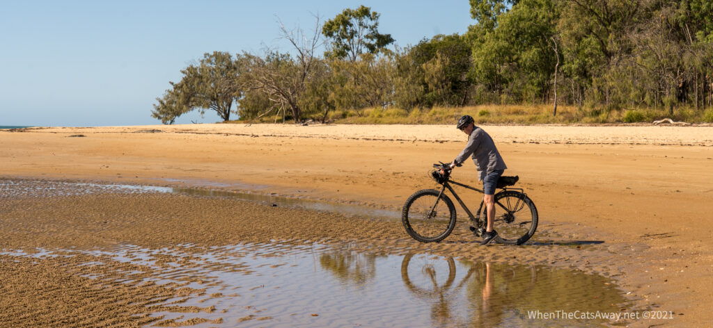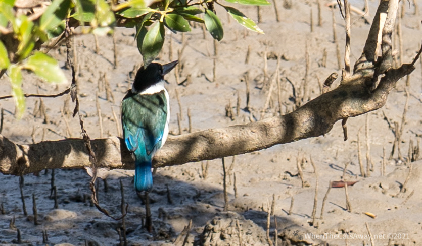 Usually cycling and birding aren’t easy bedfellows, but this ride was to prove the exception. Catherine spotted a kingfisher down by the river bank, and we later discovered it was a type we hadn’t seen before, a Torresian Kingfisher that you only find living around mangroves.