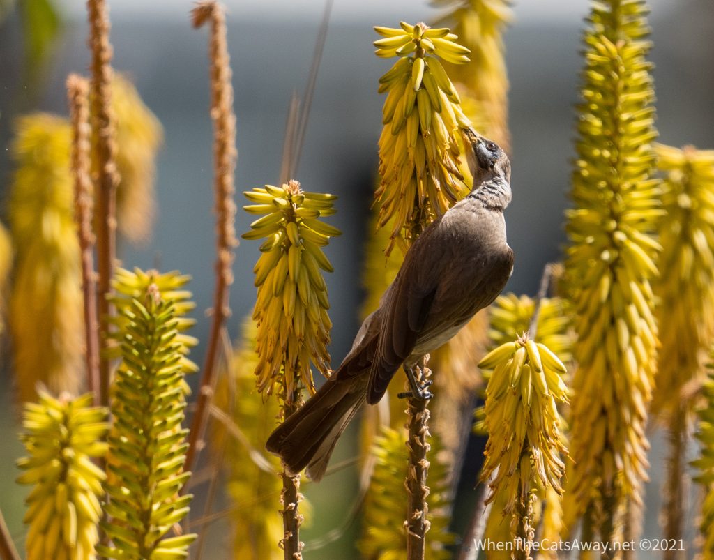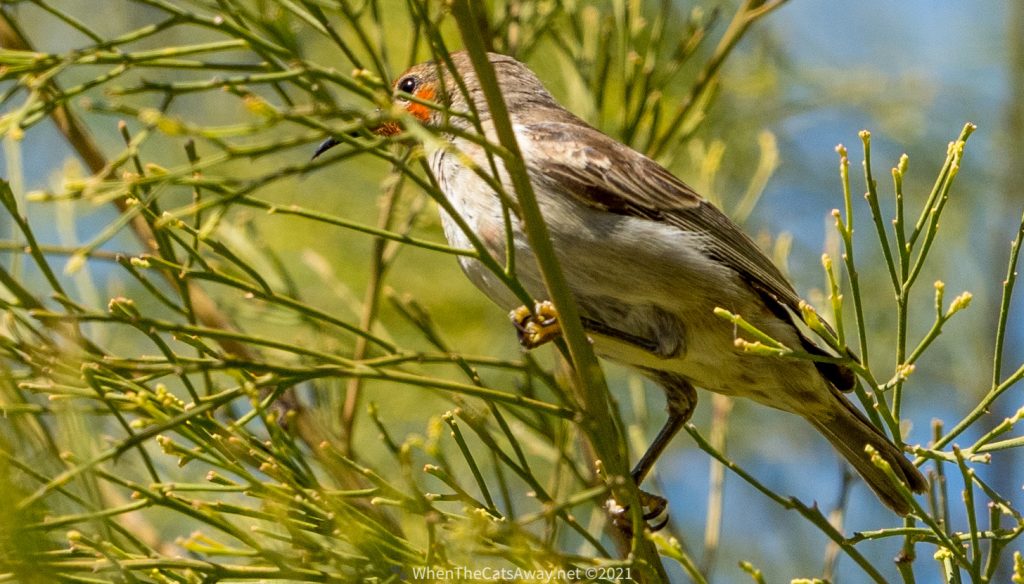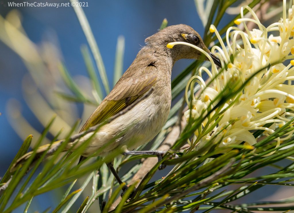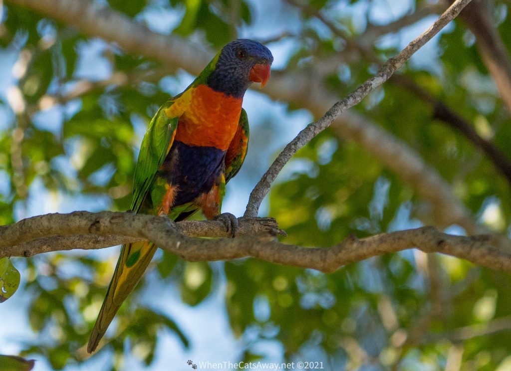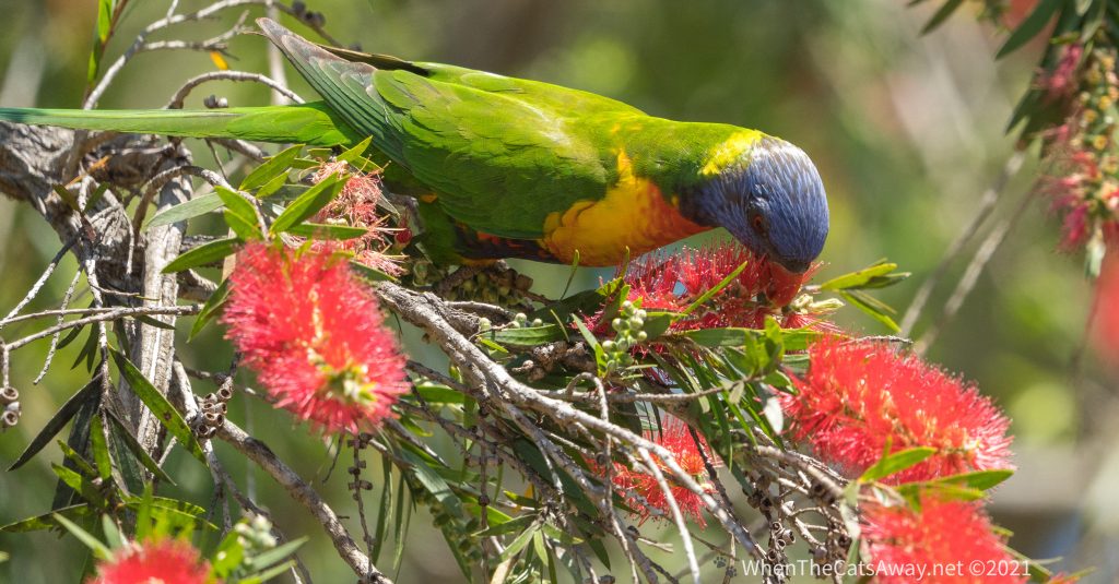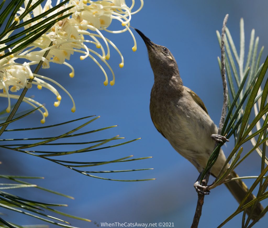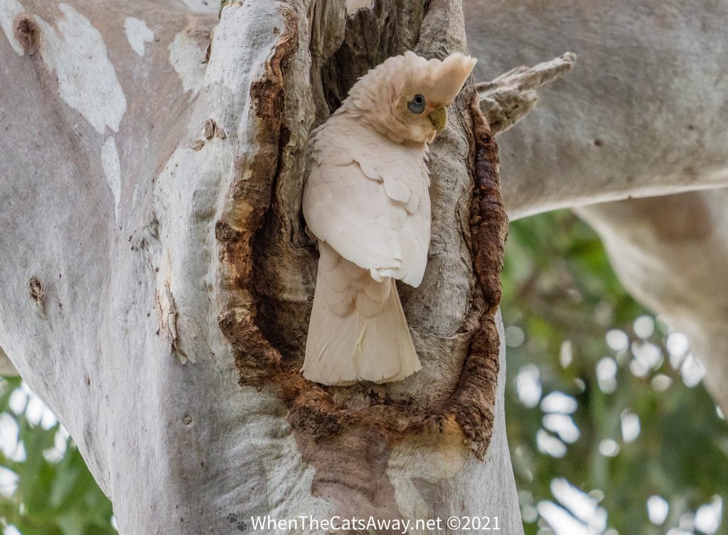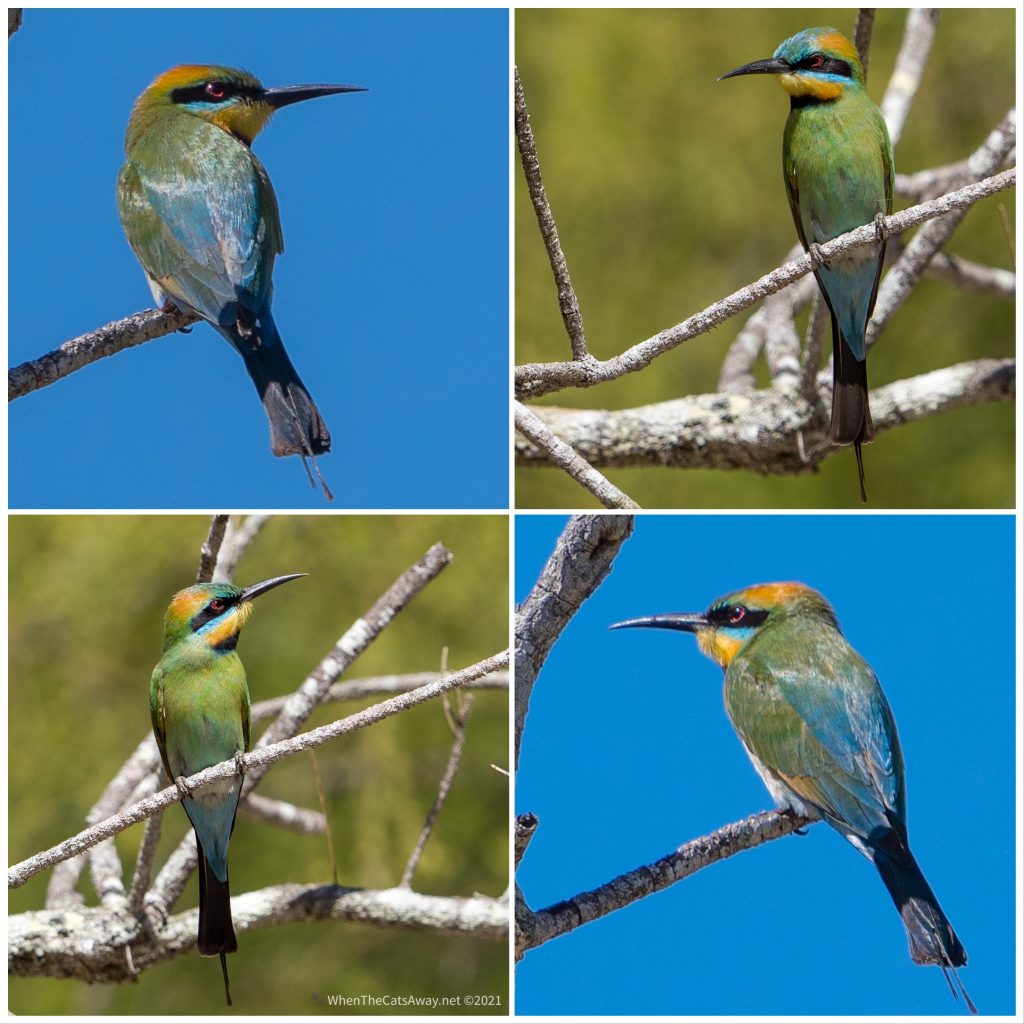 Many lovely views framed by mangrovesA brief pause along the pathwayMore lovely viewsStripes on the sand as the tide gently goes outA female Scarlet Myzomela Brown Honeyeater on a GrevilleaYou can just see this Brown Honeyeater’s tongue as it stretches towards the flowerRainbow Bee-eaters hunting for insects along the coastA Sulphur-crested Cockatoo nesting in a tree hollowA Little Corella nesting in another hollow