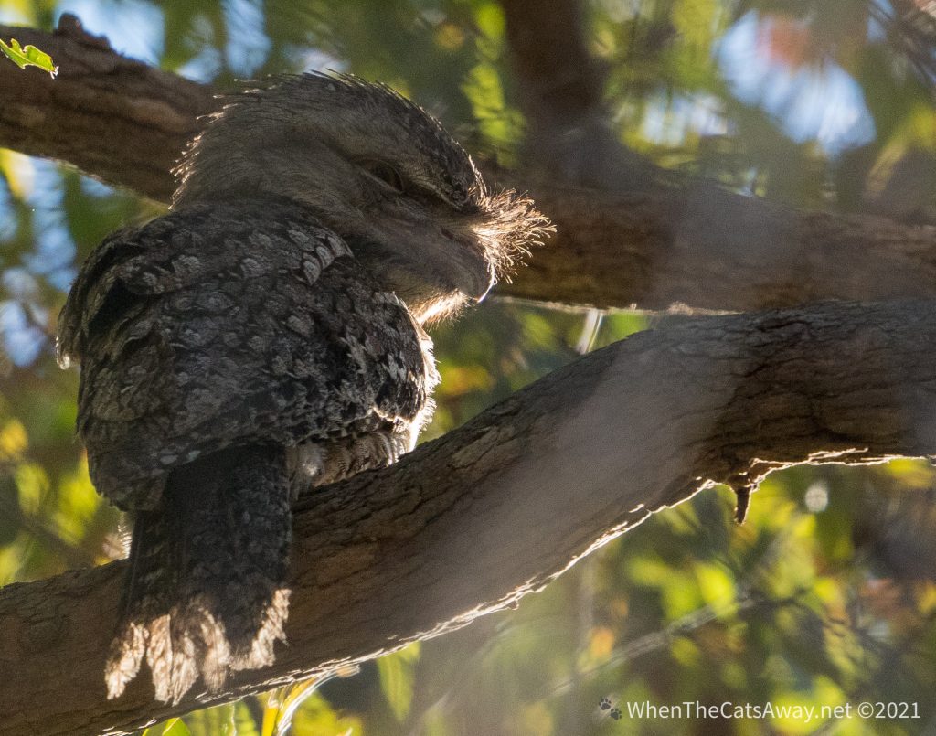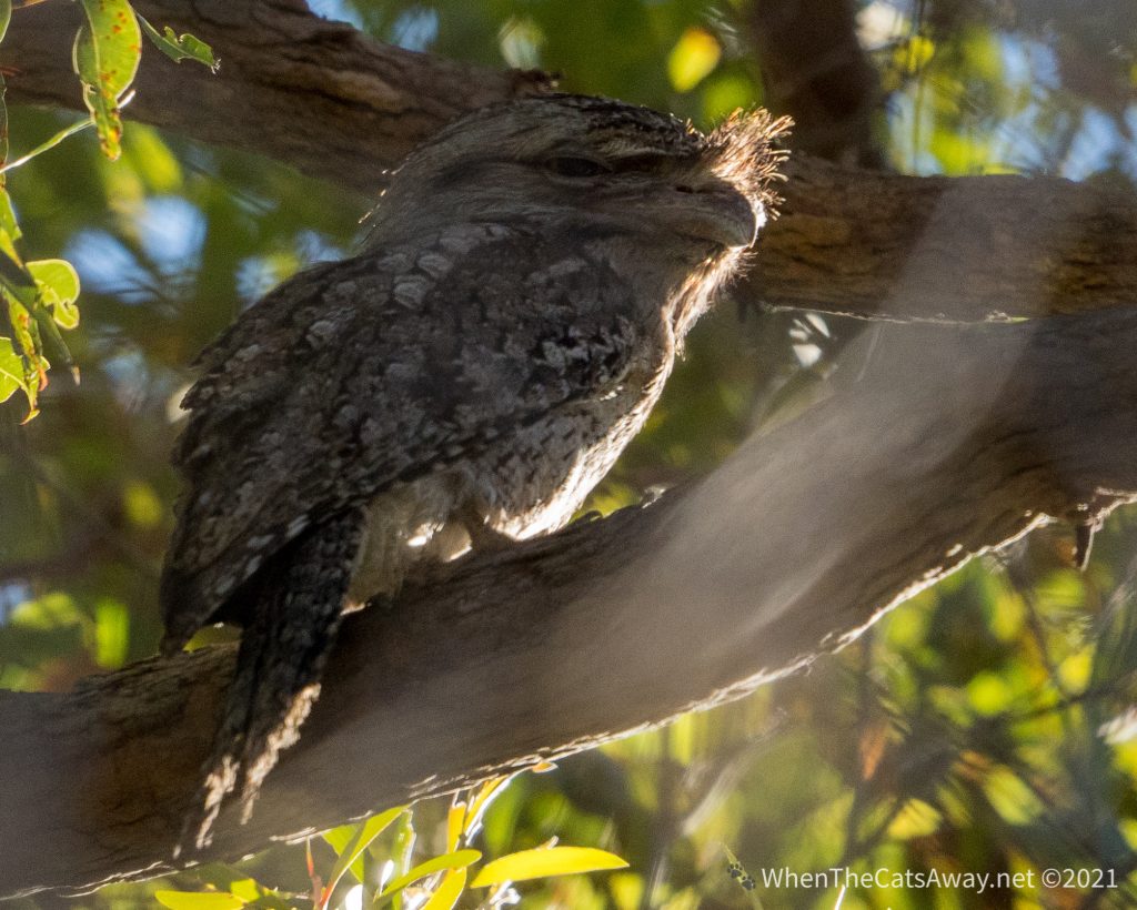 Tawny Frogmouth enjoying the afternoon sunshineTawny Frogmouth – usually very well disguised in the day, their feathers making them look like a piece of wood.A Black-faced CuckooshrikeRed-backed FairywrenA Purple-breasted Swamp HenBlue-faced Honeyeater
