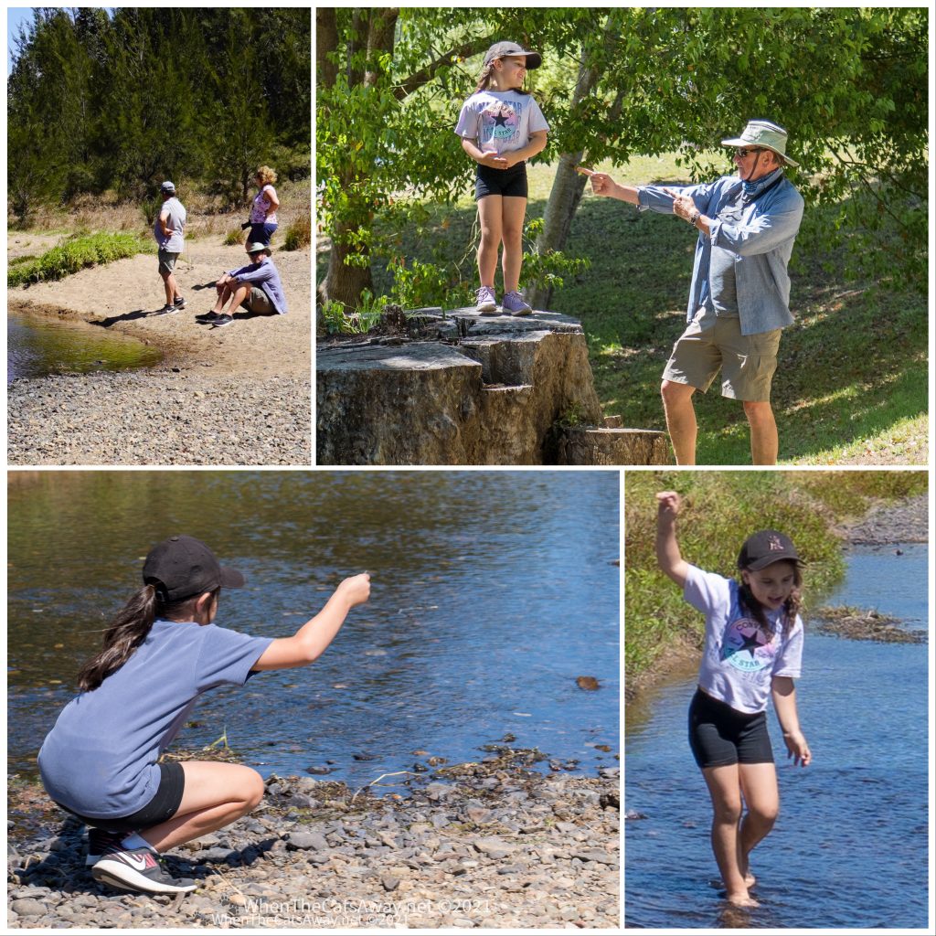 Ava learning to skim stones while Hayley paddles in the shallow river