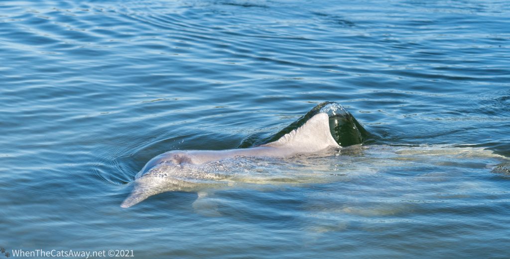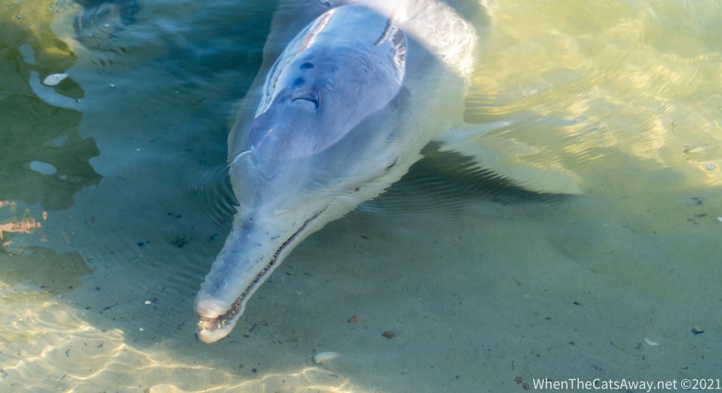 A humpback river dolphin swims in to see usSmile for the camera! These teeth are made for fish eatingMother and daughter swim in to join in the session