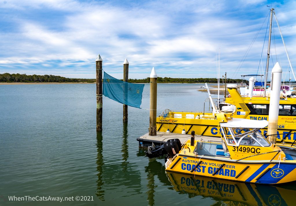 A Sacred Kingfisher on the marina alongside Griffin and Schnapper CreeksCoastgard boats along the creek side marinaLooking up the riverMangroves at low tide