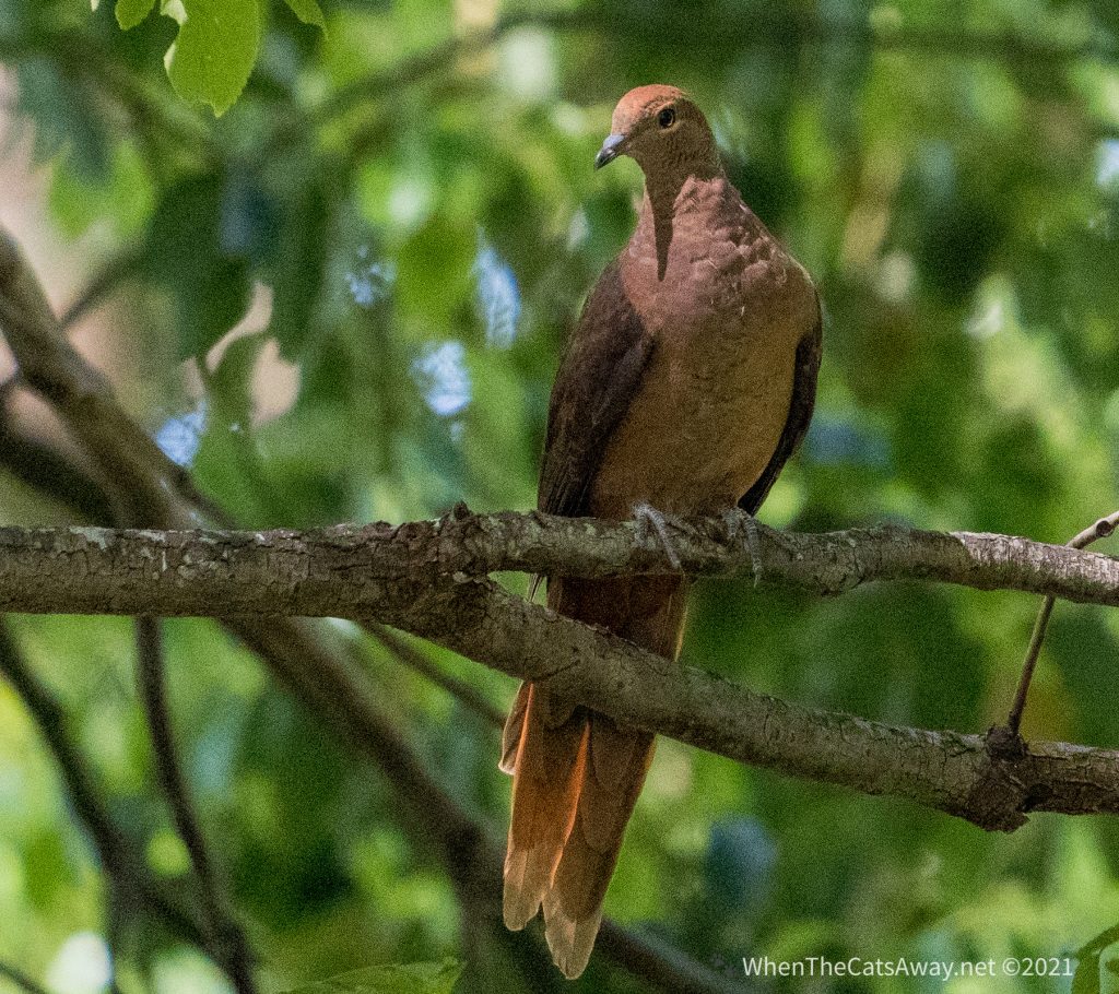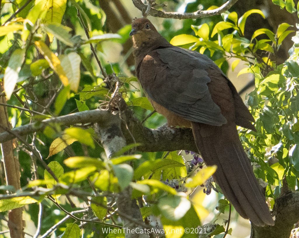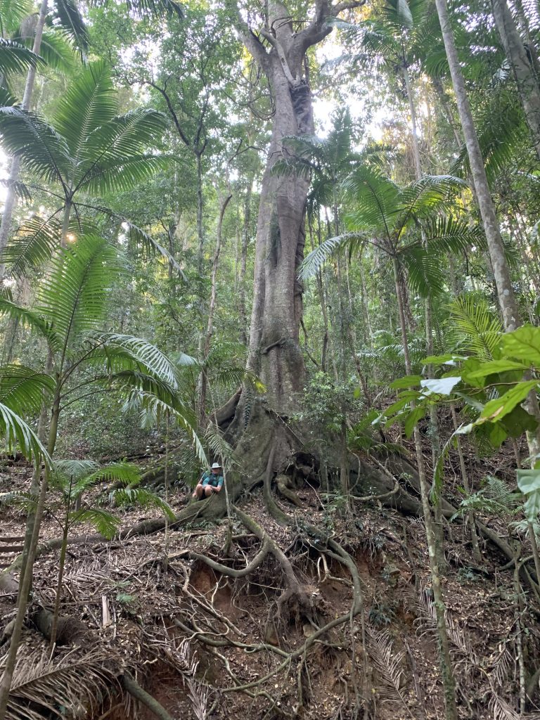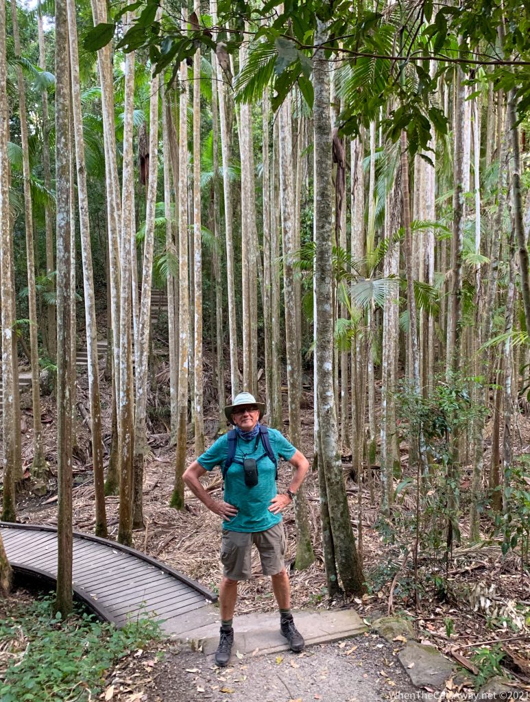 Piccabeen Palms – these 20 metre tall trees are native and attract many birdsBrown Cuckoo-Dove – look at that magnificent tail!A White-naped Honeyeater flies down to a rainforest streamMr A swamped by another rainforest giantThe views open up as we climb Beautiful flowers