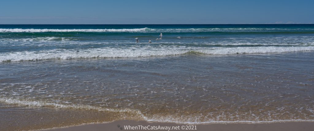 The walk emerged on the pristine Teewah Beach, and we followed the coast a short way. The sand was so fine is squeaked, somewhat like the fine snowdrifts I recall in my childhood. Walking along the hard sand on the water’s edge, occasionally dashing up the beach to escape an unruly wave, our footsteps crunching over shells, helping to contribute to future grains of sand.