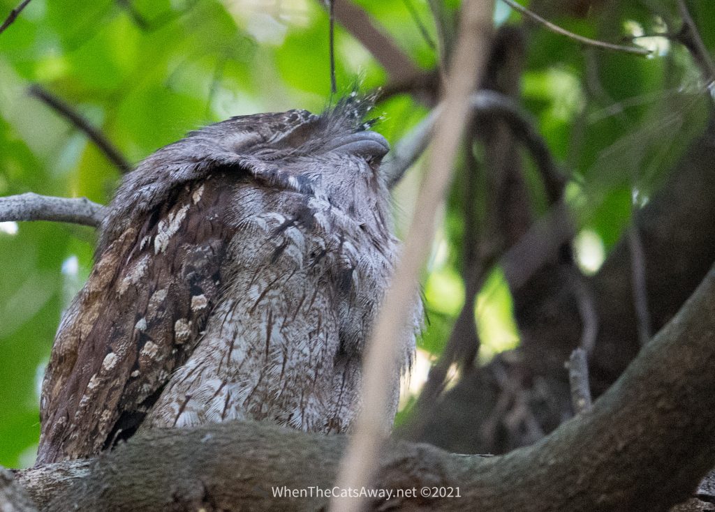 Amazingly I spotted another Tawny Frogmouth sleeping alongside the path – these nocturnal birds are not owls or related to them. They have a wide beak rather than hooked, designed for catching moths on the fly, and their feet are not talons, rather just designed for gripping a branch, more similar to a pigeon’s toes.