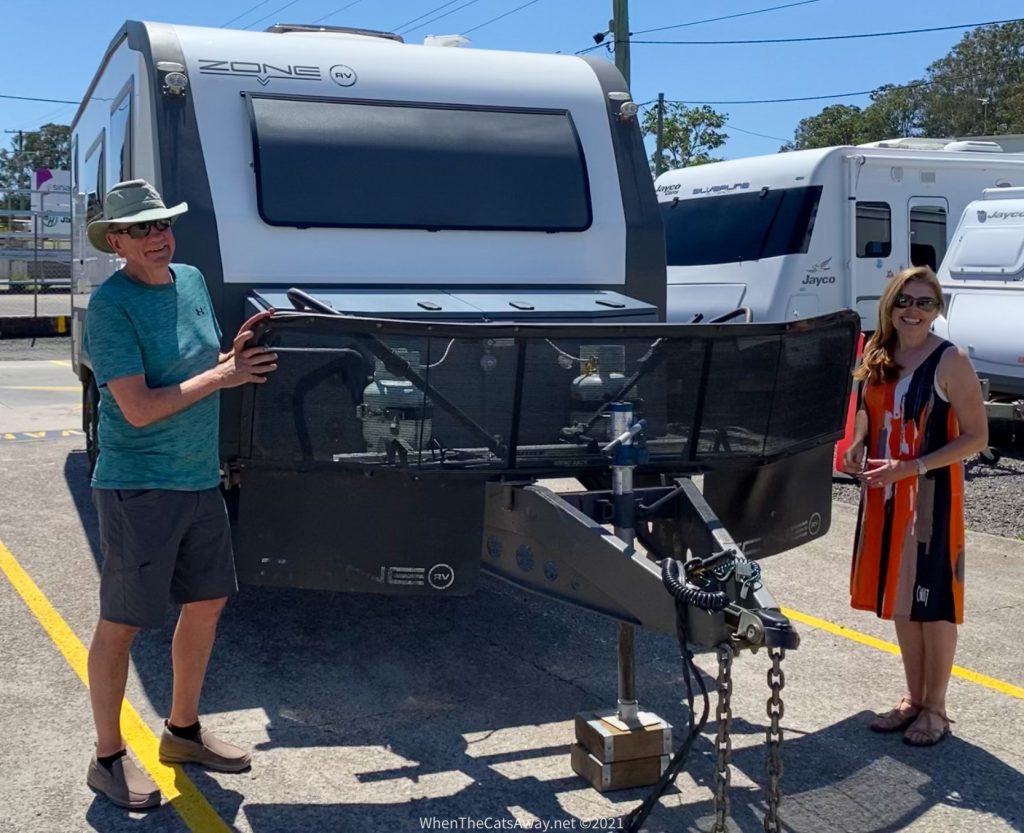As we prepare to sell our lovely luxury apartment on wheels, the Zone RV caravan, a service was required. Off down the coast we went, saying goodbye (for now) to Noosa and the friends who live there. We had booked a couple of nights at a new caravan park on the Sunshine coast, at somewhere fairly challenging to pronounce called Diddillilbah, which we soon morphed into Diddely-squat, which was a bit unfair as it was quite a decent site with large pitches and a nice restaurant in the park itself. But not really our cup of tea, purely functional, we prefer being out in the bush more. But our caravan service was scheduled just round the corner with the marvellous Suncoast Caravan Service. Our friends who used to work at our caravan manufacturer, Zone RV, both work there now. The power couple of the Sunshine Coast Caravan Industry, Marsha and Rhys Gehrke.