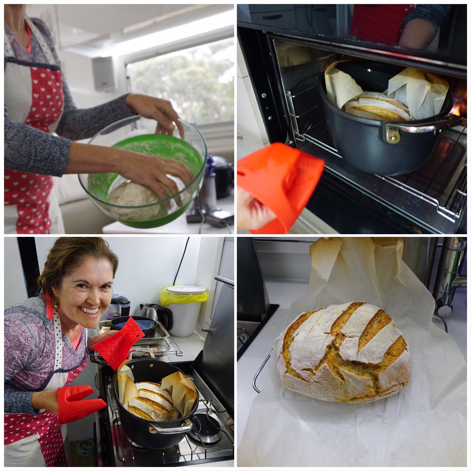 We returned to camp via a quick grocery shop and got the sourdough tucked up for its 4 hour proving stage. I got out our curry cookbook and decided to tackle another interesting meal for dinner, this time a Myanmar chicken curry – Kye thar hin – a very tasty recipe. The sourdough finally made it into the oven, and is now cooling ready for breakfast in the morning. Looking and smelling good – hope it tastes good too!