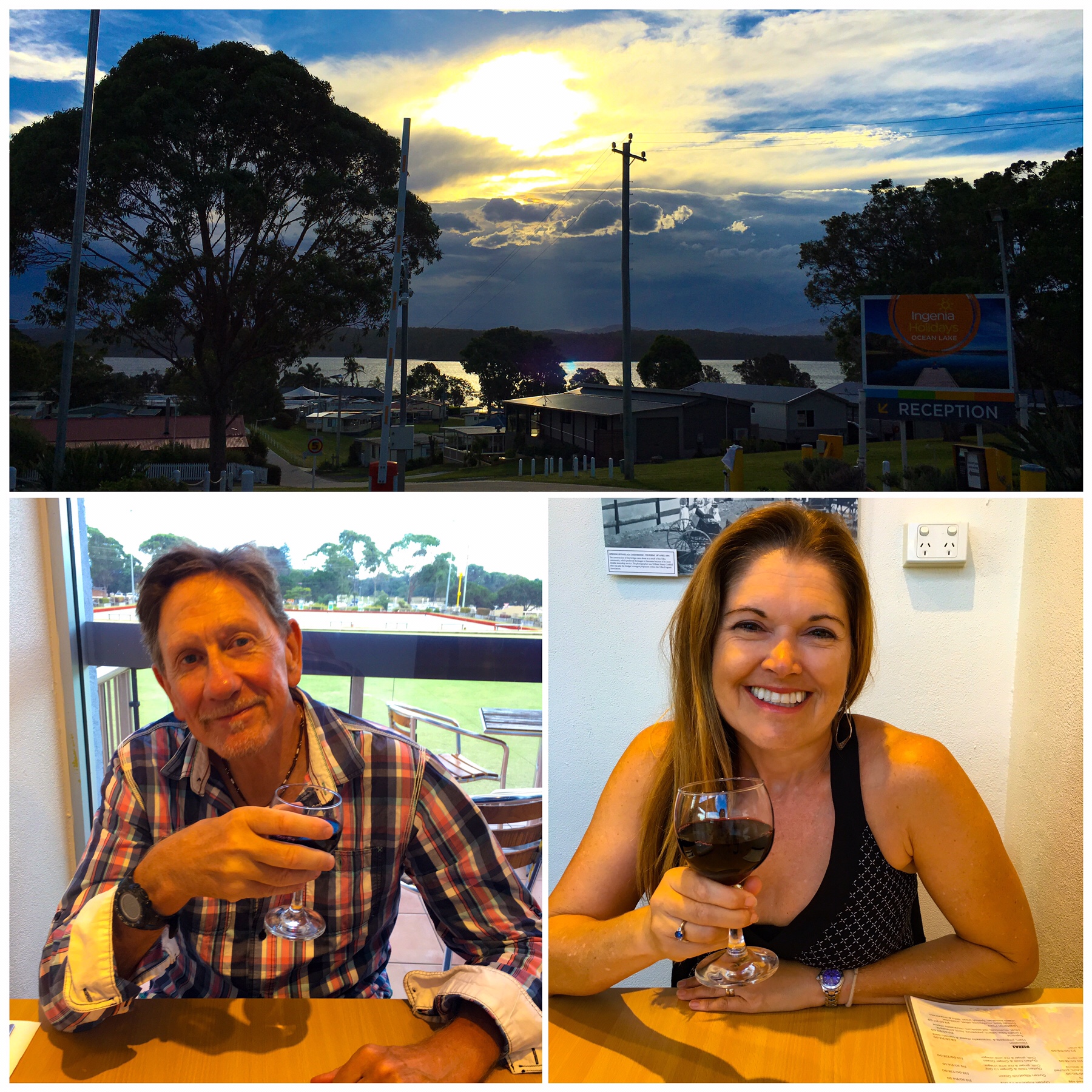 This evening we booked a night out, to the centre of all local action – the Bermagui Country Club – it sounds much posher than it actually is! It does have a restaurant with a great reputation for seafood though, and we can both testify that reputation is well deserved. I had a HUGE seafood platter which apparently came with chips that I didn’t even reach, and Mr A went for the Blue Grenadier, in large. Both dishes under $35 for a lot of food! Wine was a Barossa cold climate Shiraz which was very drinkable for just $25 a bottle (although when Mark went to order it the lady behind the bar brought out a bottle of white….perhaps wine is not often bought here?).