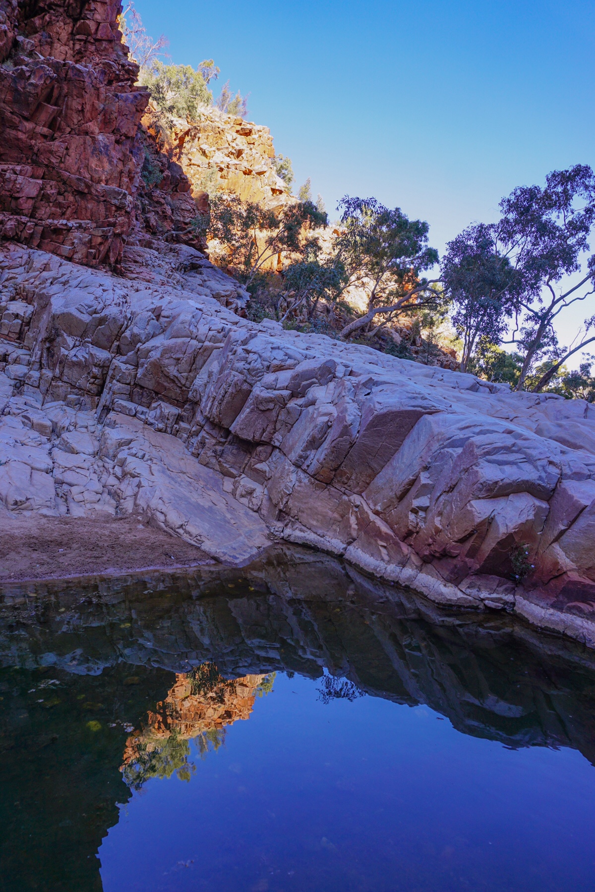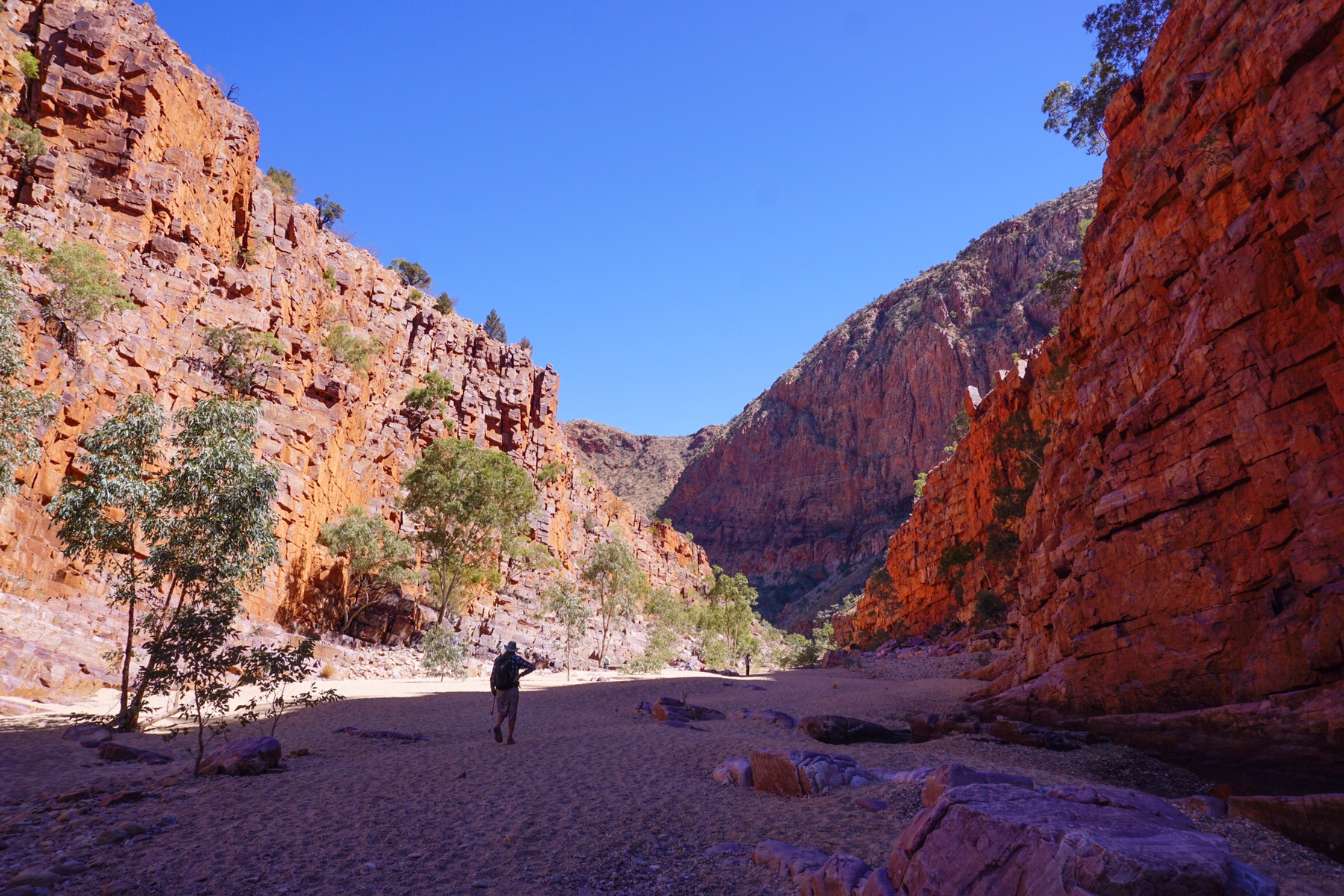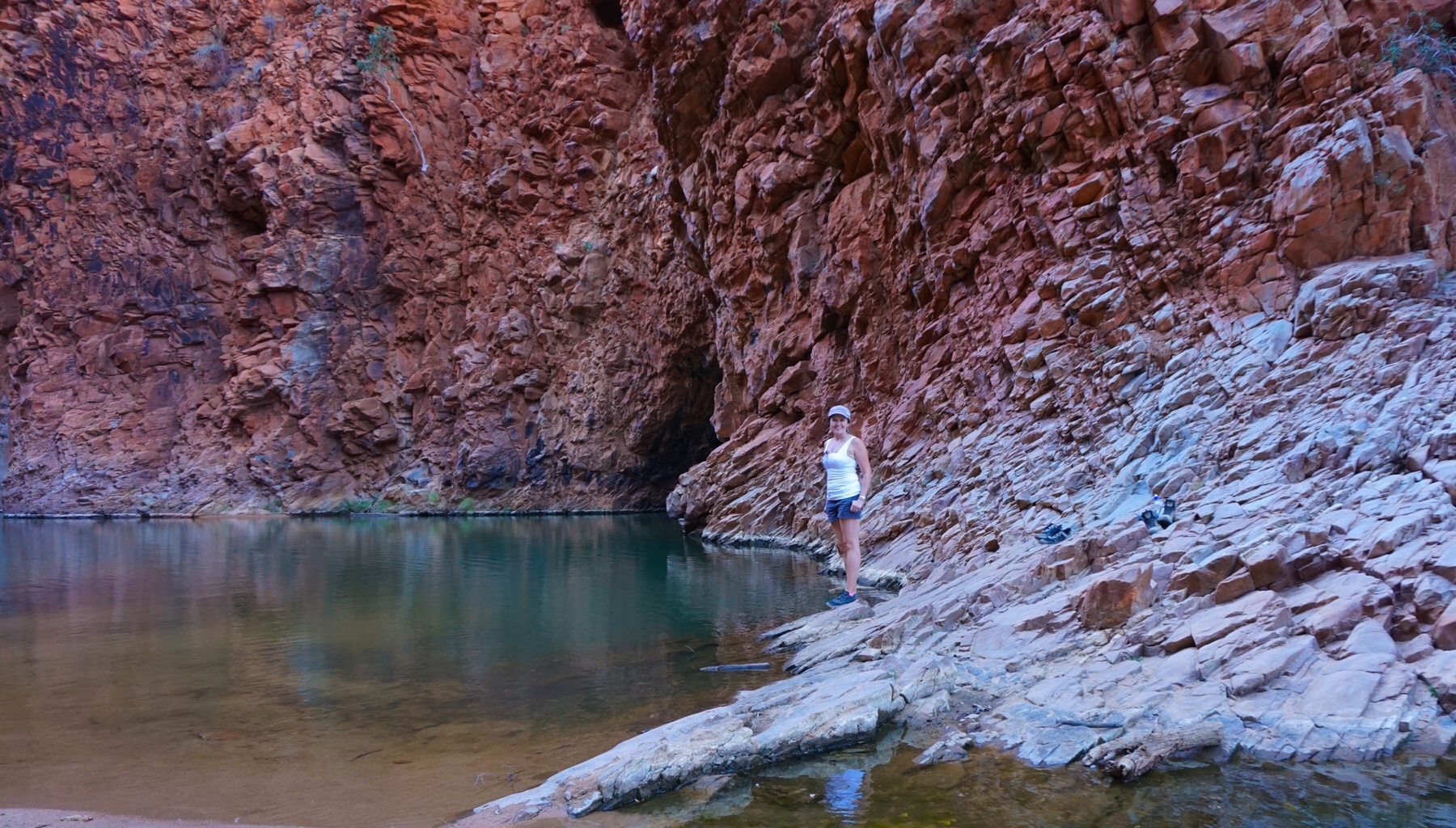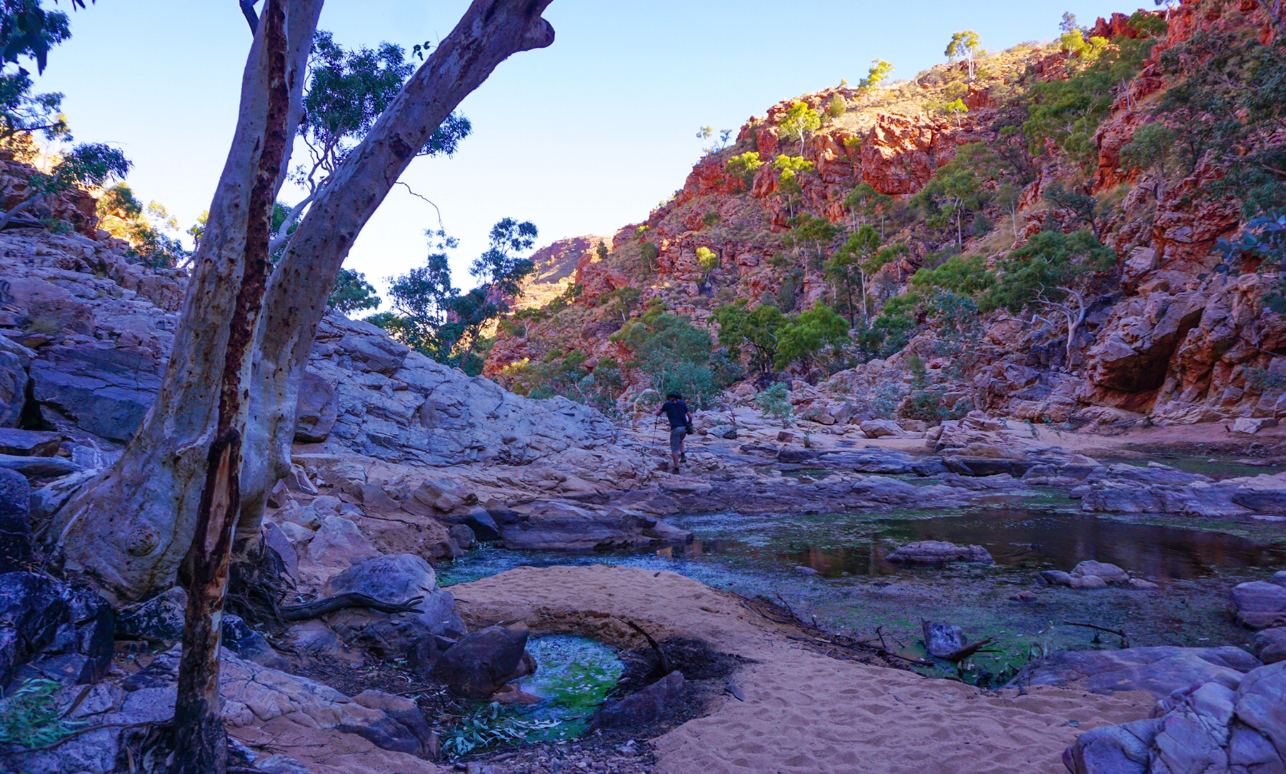 The Gorge is one of several in the West MacDonnell ranges, which spectacularly rise up out of the desert plain and stretch several hundred kilometres. We rocked up at was to be one of our prettiest campsites on this section of the trip, with views down into the gorge. We quickly unhitched and drove down the steep access road, parked up and hit the short trail into the gorge proper.